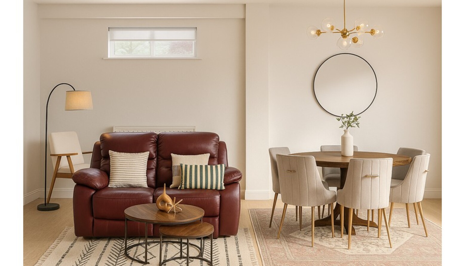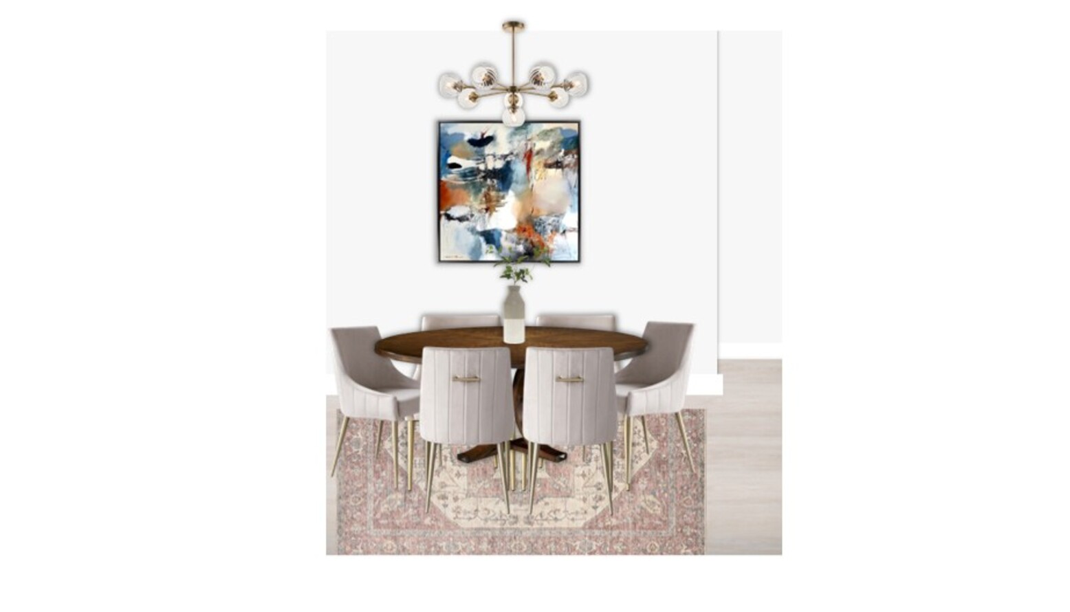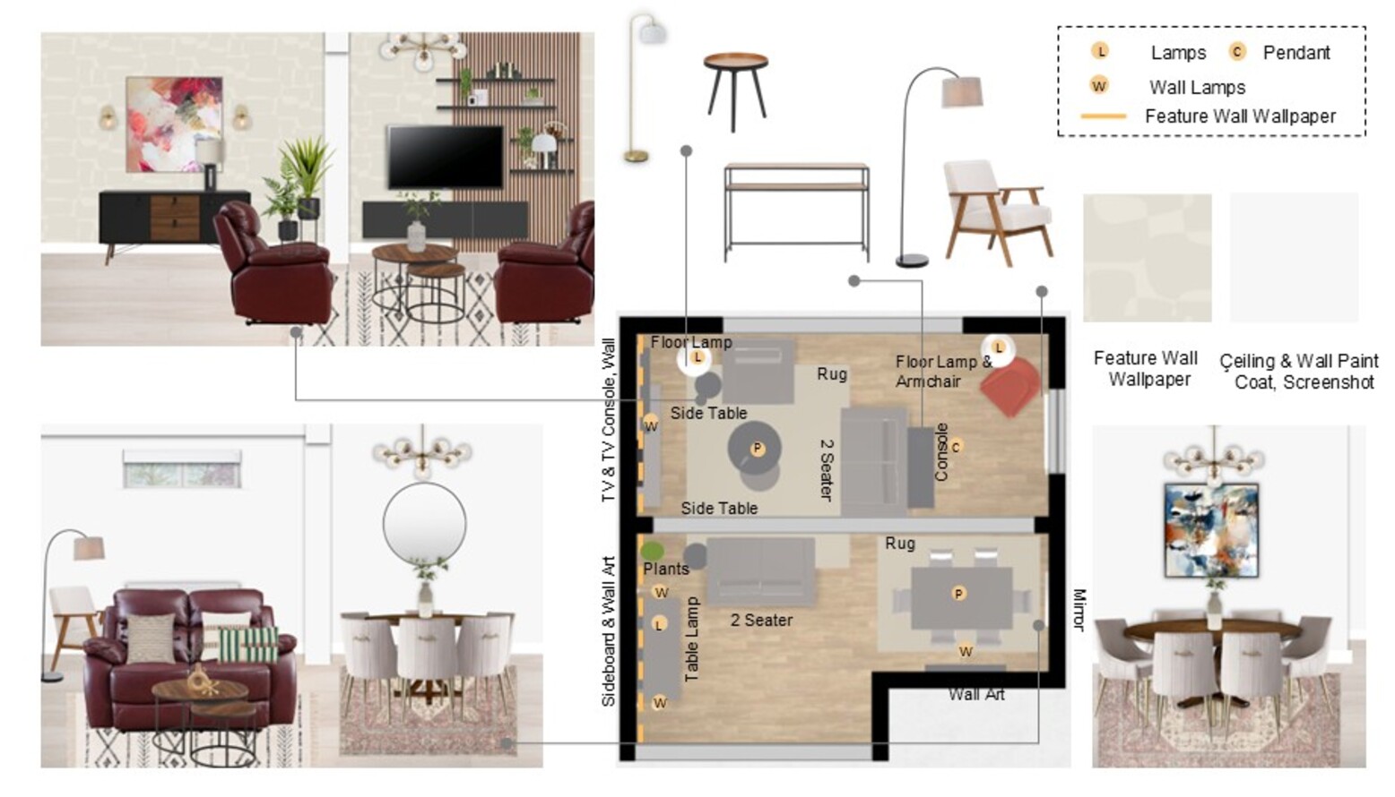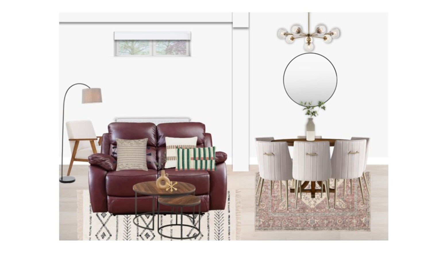 Overall, this living dining room is envisioned as a versatile space that balances style and comfort, perfect for both entertaining and unwinding.