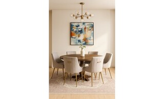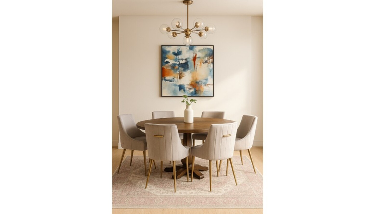 The living dining room features a harmonious blend of contemporary design and cozy comfort. A dark walnut sideboard with two doors and two drawers anchors the space, providing both storage and style. Above it hangs an abstract artwork that infuses the room with vibrant colors and character.