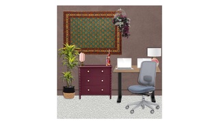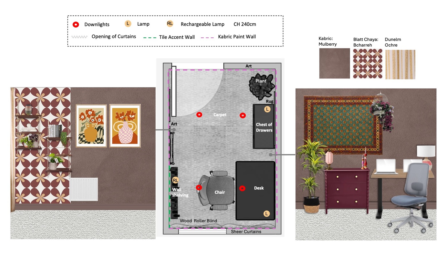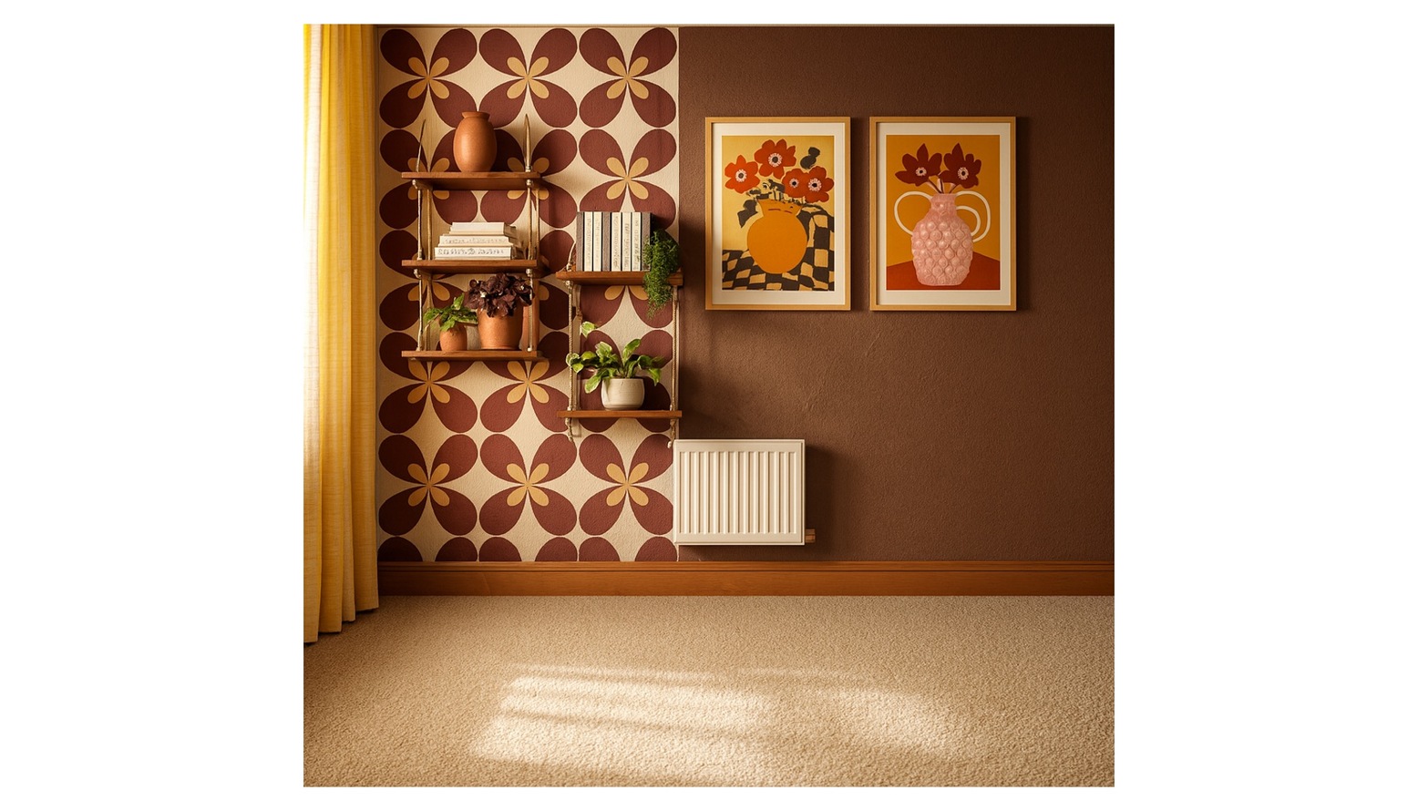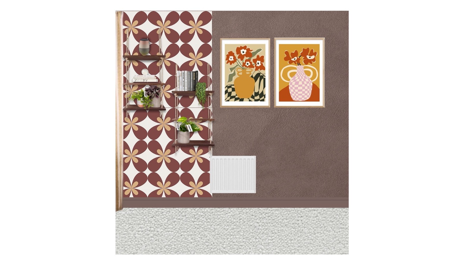 This home office exudes a warm and inviting atmosphere, enhanced by a rich color palette of browns and earthy tones. A striking feature wall showcases a bold floral pattern, creating a vibrant backdrop that harmonizes with the overall scheme.