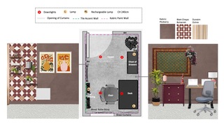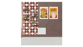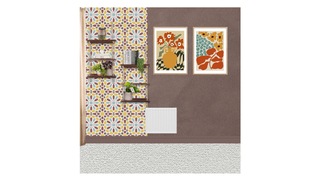 To the side, two framed art pieces lean against the wall, featuring vibrant illustrations that incorporate complementary colors. These artworks add a personal touch, enhancing the character of the space.