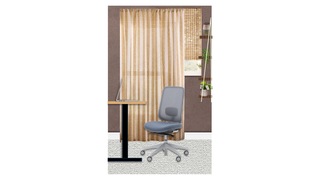 The floor is covered with soft beige carpeting, providing a cozy feel underfoot. Natural light streams through sheer yellow curtains, contributing to a bright and cheerful workspace.