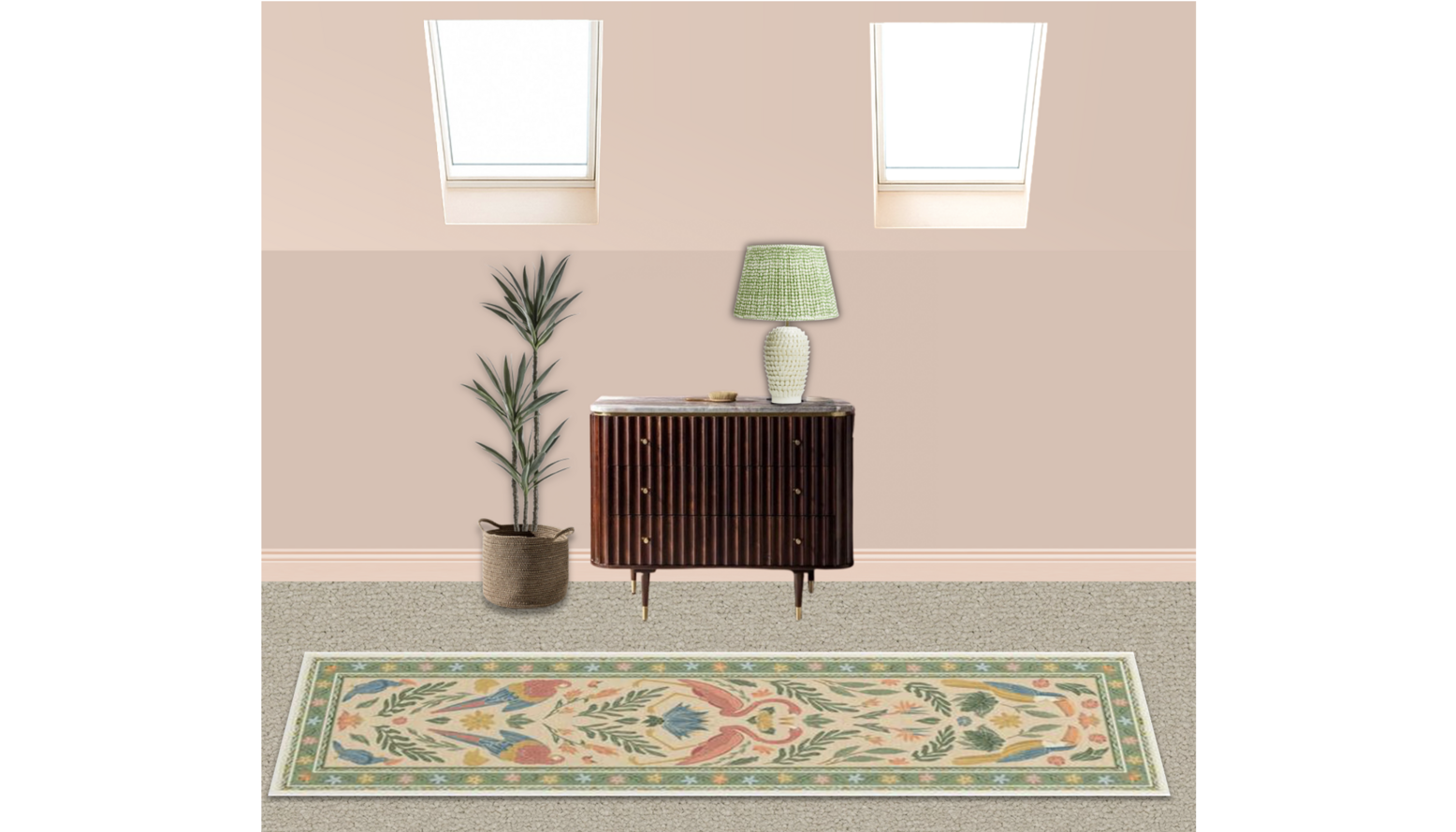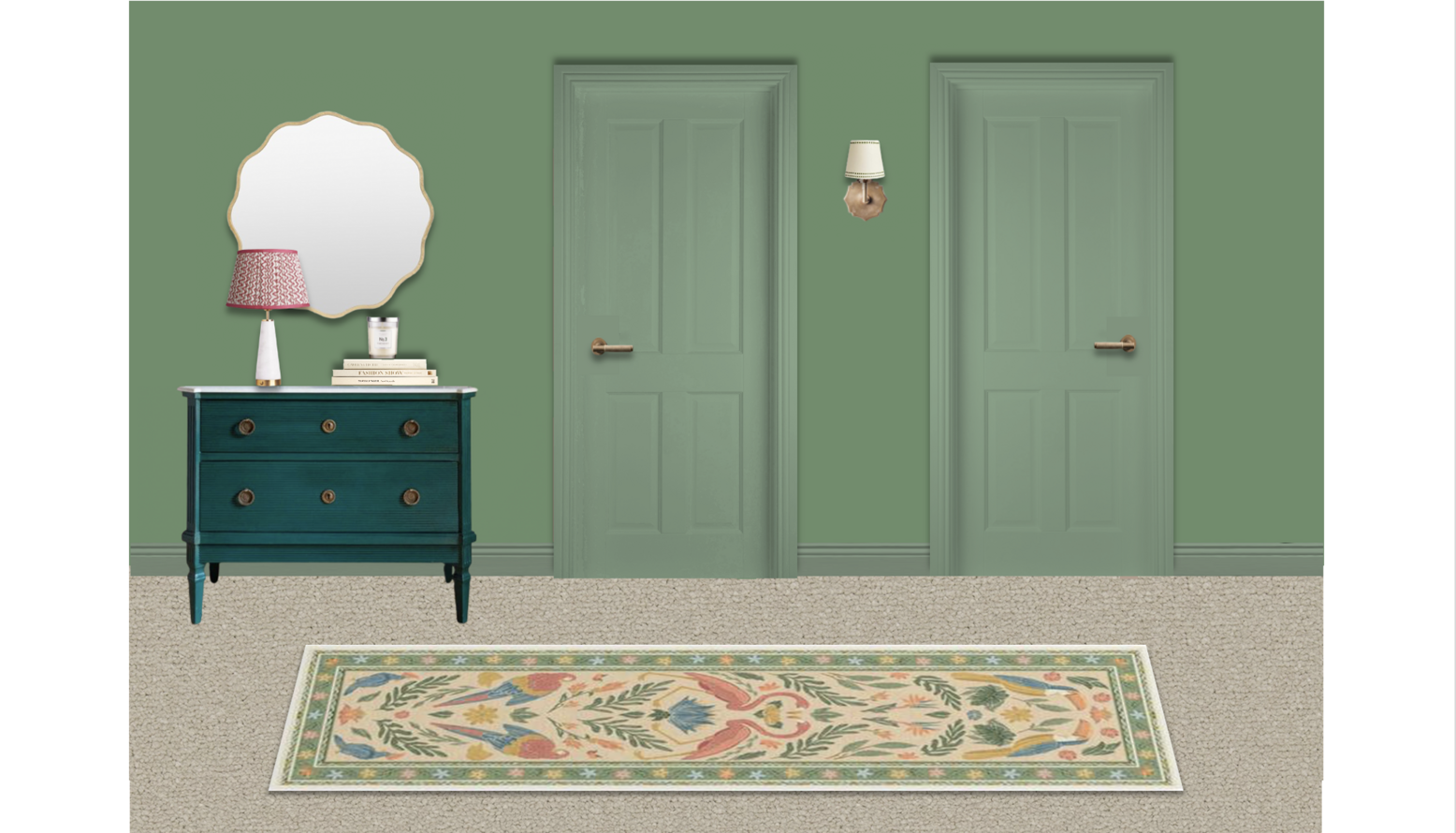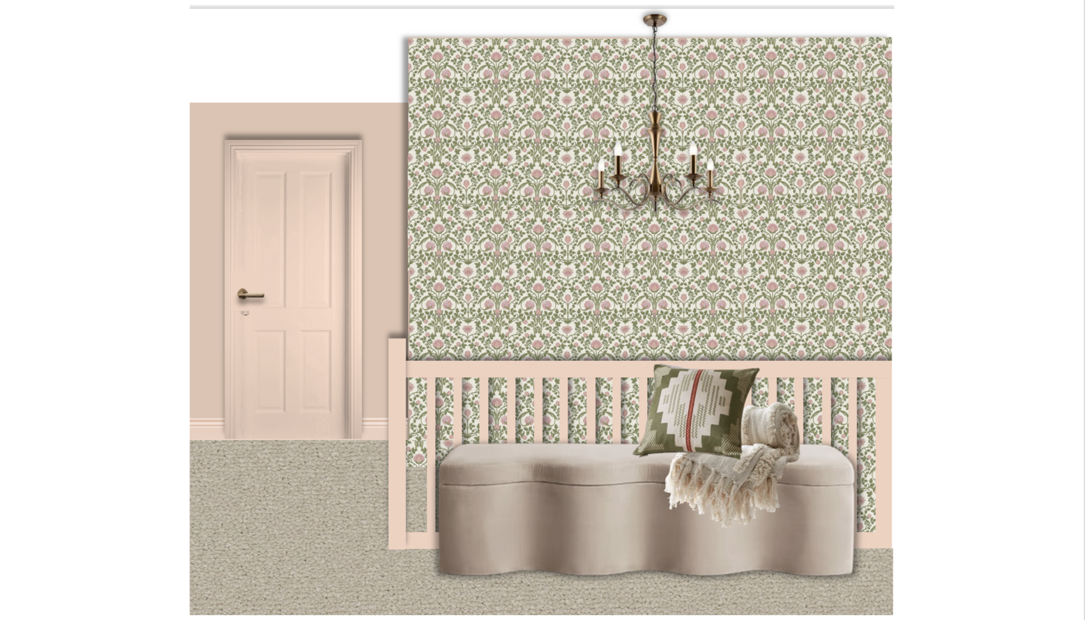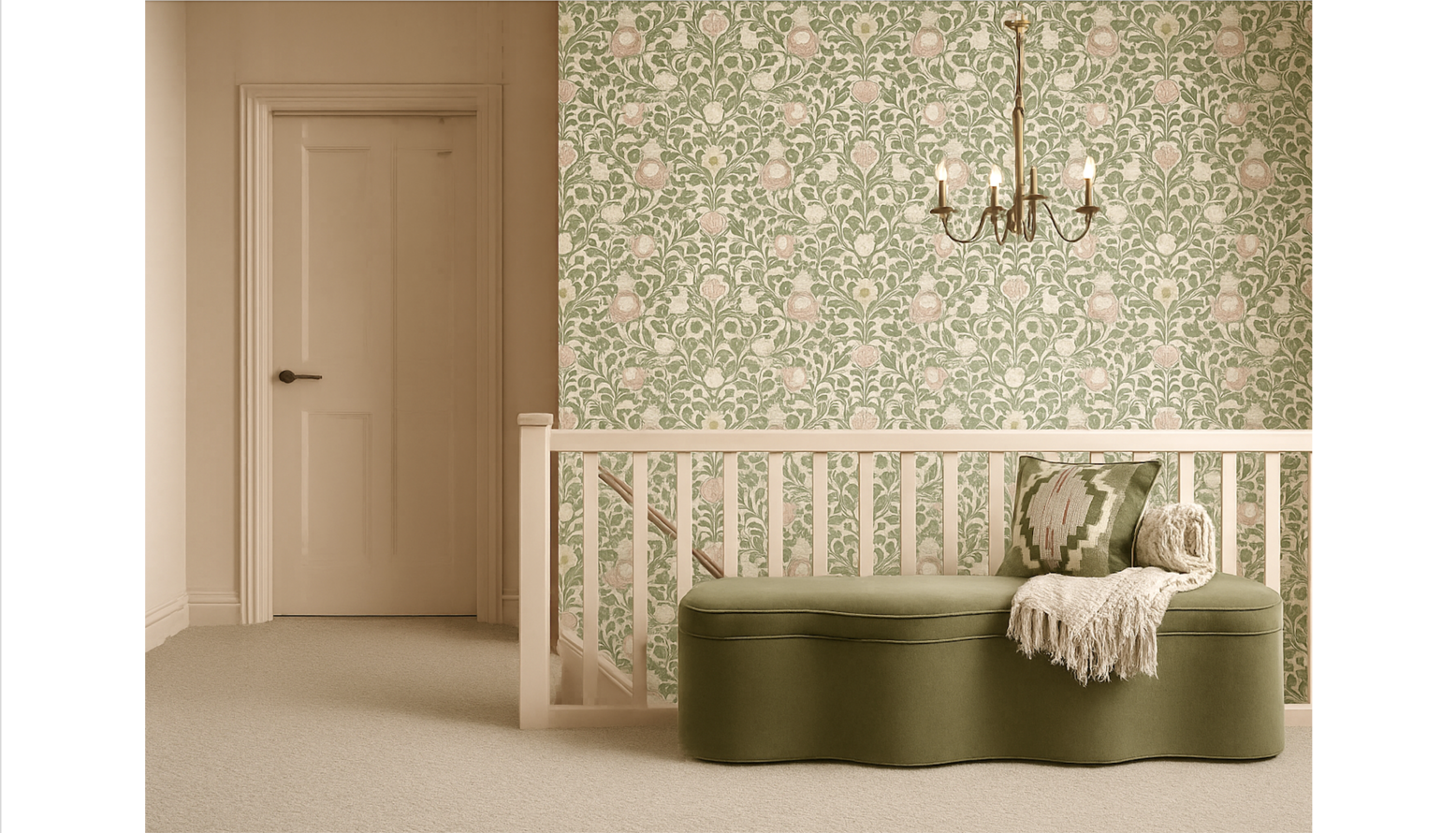 The hallway showcases a delicate blend of elegance and comfort, highlighted by the eye-catching Lottie Green and Marble Chest of Drawers, which stands prominently against a backdrop of lush, floral-themed wallpaper. The Eli Storage Bench in rich lichen velvet complements this setting, providing both style and functionality. An intricate piece of Vintage Pink Flamingo Framed Art adds a touch of whimsy to the design. A Clara Pink & Green Stripe Glass Desk & Table Lamp and a straight empire lampshade in temple green block printed cotton illuminate the space, enhancing the cozy atmosphere. The Sloane Round Mirror reflects the ornate details of the room while casting a sense of openness. Grounding the space is the Birds Of A Feather Green & Peach Flatwoven Rug, which brings warmth and texture underfoot, accompanied by the Sphynx rechargeable table lamp in white marble for a modern touch. Accessorizing the hallway are the John Lewis Tulum Cushion in avocado, offering a pop of color, and the Gabbro Woven Bobble Throw for added warmth. The Kora 5 Pendant Light in antique brass adds a sophisticated overhead fixture. Floral life is enriched by the striking The Little Botanical Extra Large Lemon Dracaena and the Yucca Tree, complimenting the overall greenery of the design. For fragrance enhancement, the Voluspa Wicked Mini Tin Scented Candle Gift Set introduces an inviting aroma. Overall, the hallway is enveloped in neutral tones and floral accents creating a welcoming ambiance, making it a perfect transition space in the home.
