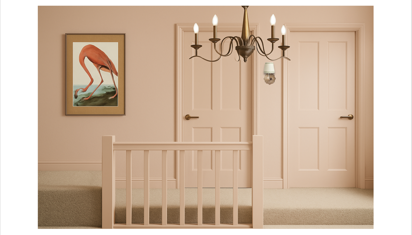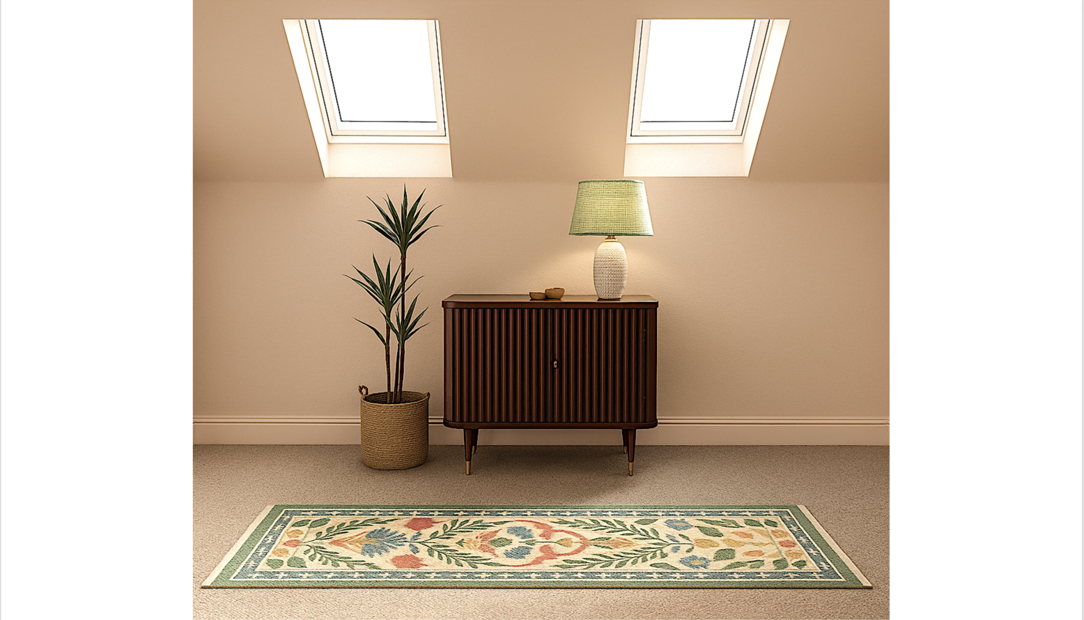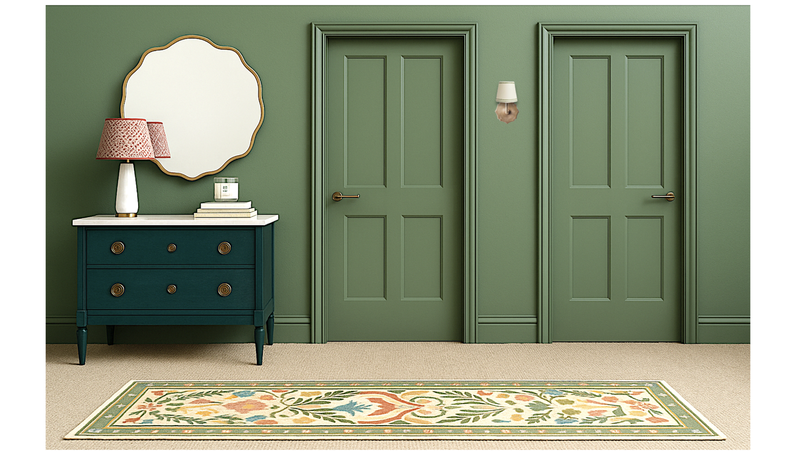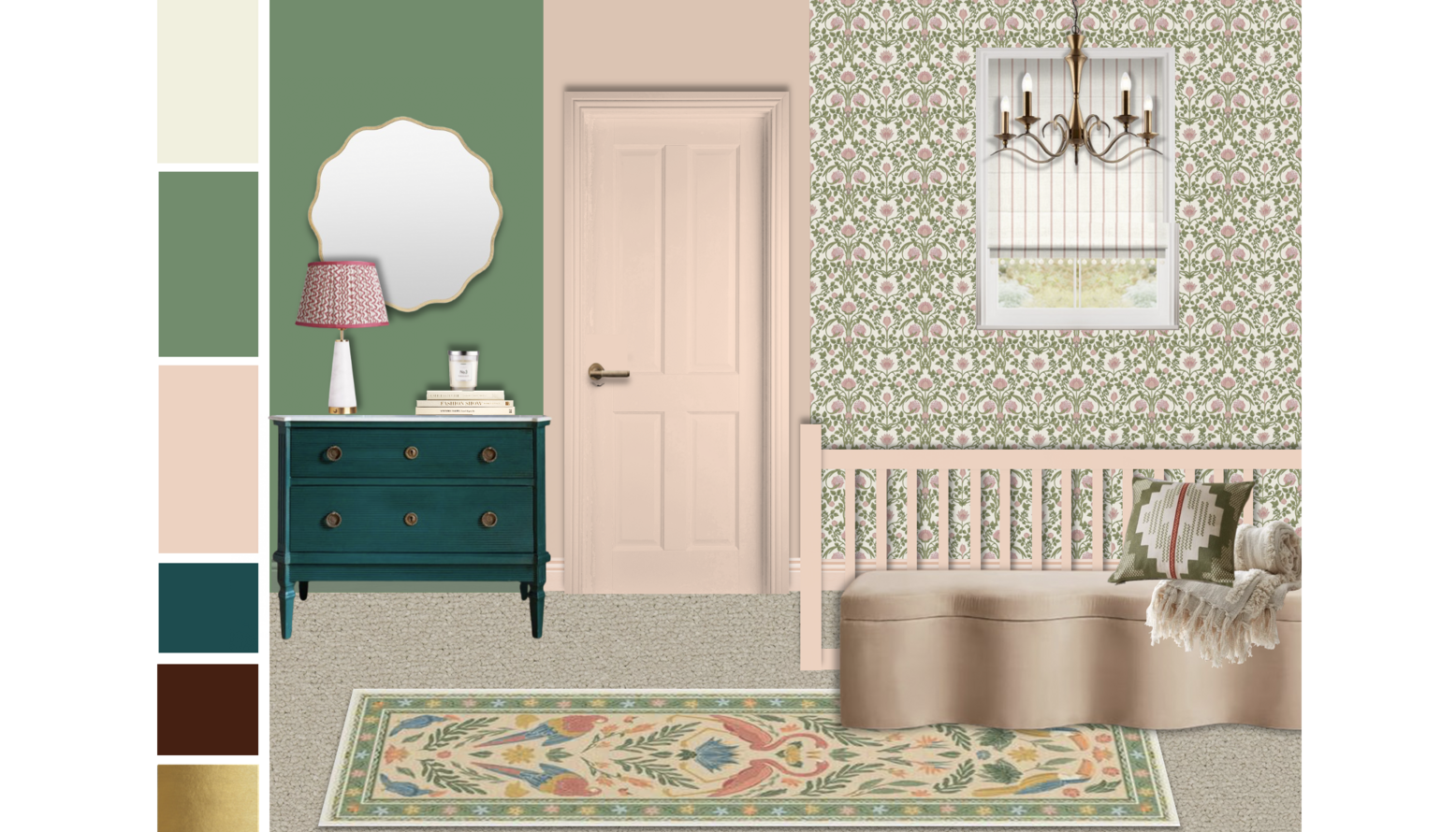 The hallway showcases a delicate blend of elegance and comfort, highlighted by the eye-catching Lottie Green and Marble Chest of Drawers, which stands prominently against a backdrop of lush, floral-themed wallpaper. The Eli Storage Bench in rich lichen velvet complements this setting, providing both style and functionality. An intricate piece of Vintage Pink Flamingo Framed Art adds a touch of whimsy to the design. A Clara Pink & Green Stripe Glass Desk & Table Lamp and a straight empire lampshade in temple green block printed cotton illuminate the space, enhancing the cozy atmosphere. The Sloane Round Mirror reflects the ornate details of the room while casting a sense of openness. Grounding the space is the Birds Of A Feather Green & Peach Flatwoven Rug, which brings warmth and texture underfoot, accompanied by the Sphynx rechargeable table lamp in white marble for a modern touch. Accessorizing the hallway are the John Lewis Tulum Cushion in avocado, offering a pop of color, and the Gabbro Woven Bobble Throw for added warmth. The Kora 5 Pendant Light in antique brass adds a sophisticated overhead fixture. Floral life is enriched by the striking The Little Botanical Extra Large Lemon Dracaena and the Yucca Tree, complimenting the overall greenery of the design. For fragrance enhancement, the Voluspa Wicked Mini Tin Scented Candle Gift Set introduces an inviting aroma. Overall, the hallway is enveloped in neutral tones and floral accents creating a welcoming ambiance, making it a perfect transition space in the home.