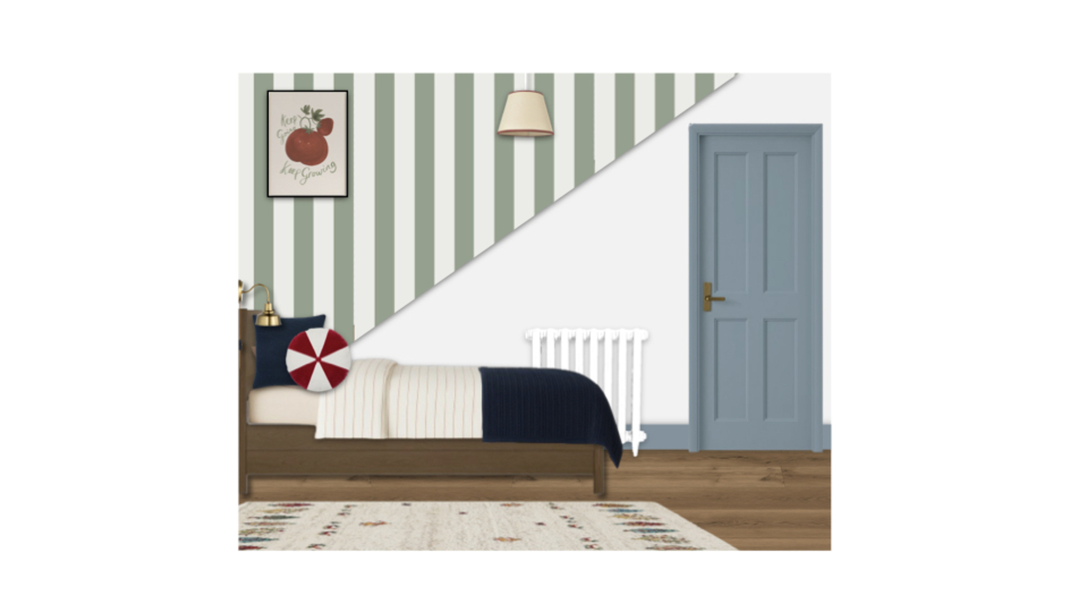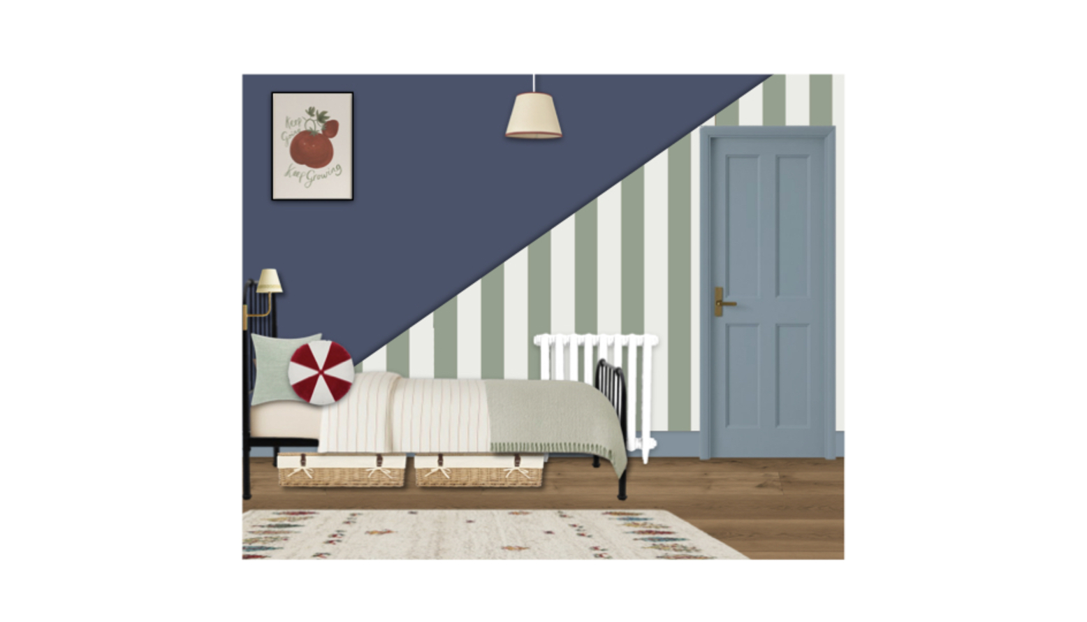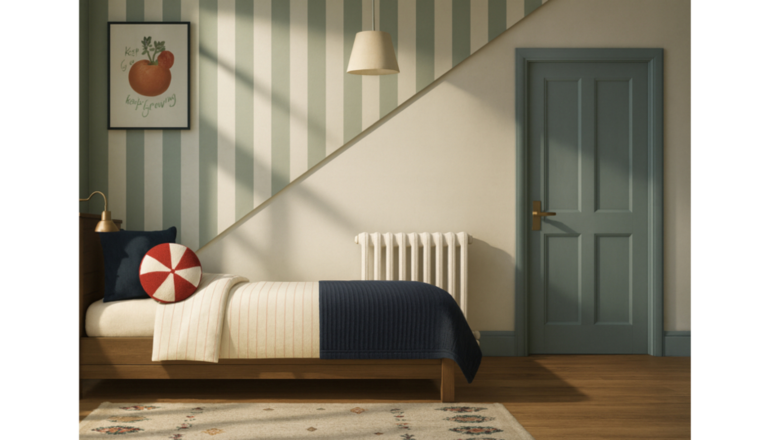 This children's bedroom exudes a playful yet cozy atmosphere. The walls are adorned with soft, alternating stripes of muted green, creating a whimsical backdrop. A low, slanted ceiling adds character and warmth to the space.