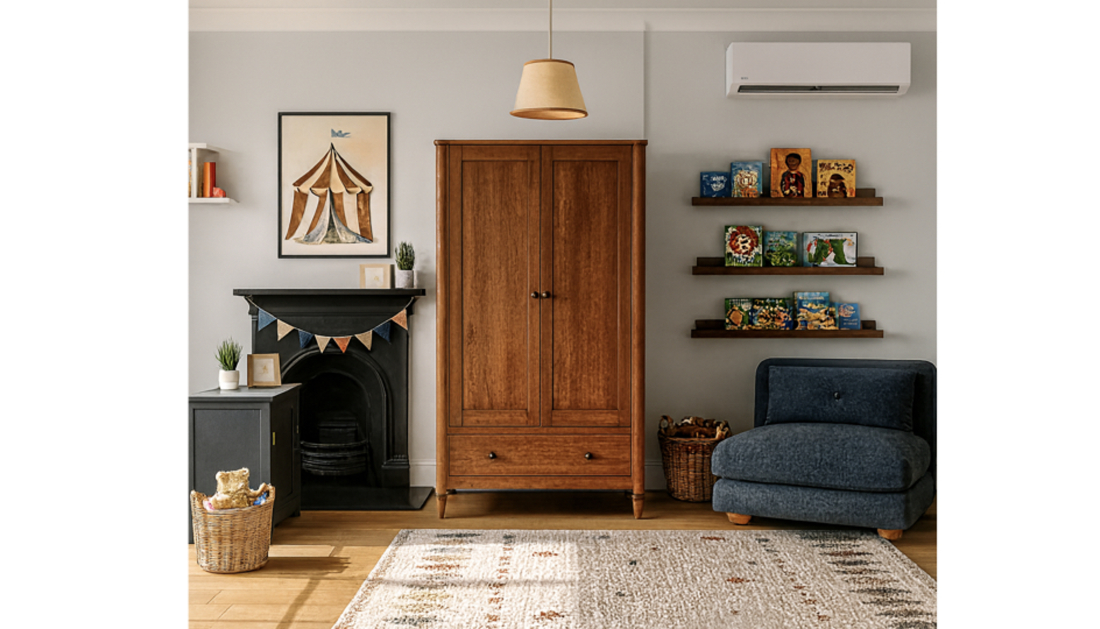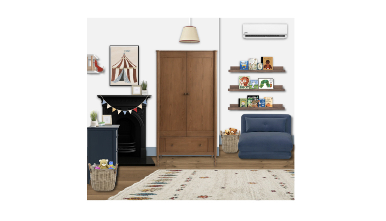 The wardrobe, finished in blue, neatly stores clothing and toys, while a bamboo lidded underbed storage basket provides practical storage solutions.