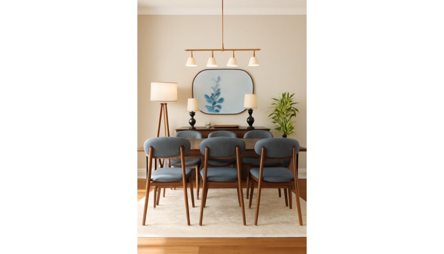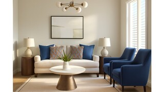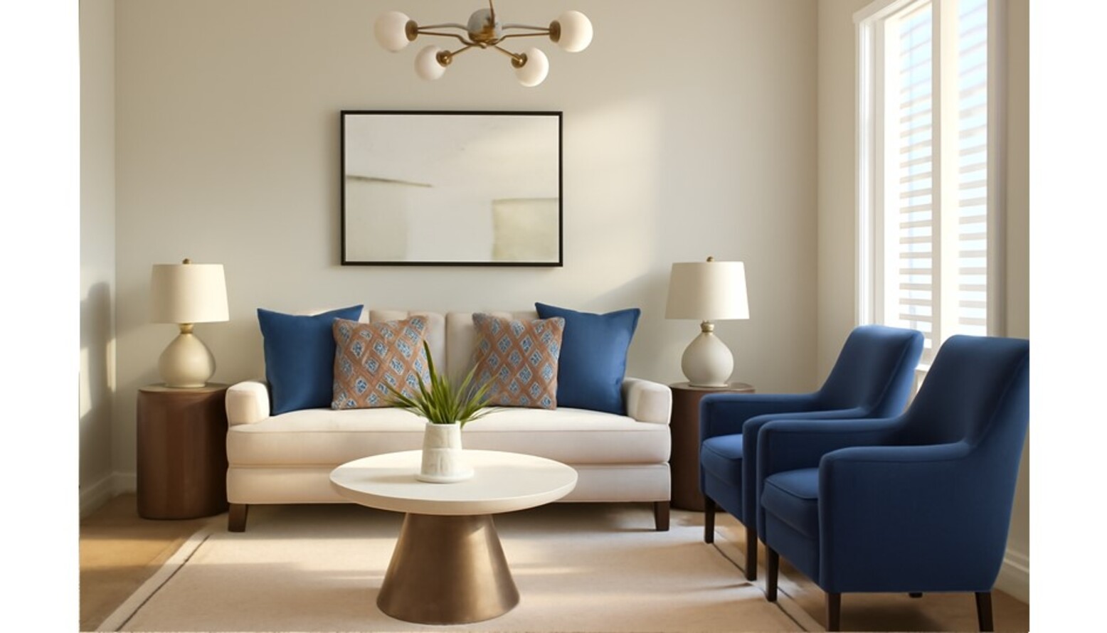 This vibrant triple-function room includes a cozy living area, a dining space, and a well-integrated kitchen. The living area features a light travertine coffee table with a unique conical base, paired with a soft beige sofa adorned with plush, colorful cushions in burnt orange and air force blue. Two elegant blue chairs frame the sofa, enhancing the room's modern aesthetic. A warm accent, such as a floor lamp with a matte black finish, adds depth and mood lighting.