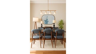 On the walls, a calming art piece brings character, complemented by a sleek wall-mounted shelf displaying decorative items. Natural light floods the space through large windows, highlighting the light and airy atmosphere. The dining area is anchored by a beautiful black and natural acacia wood table, surrounded by stylish seating options. Decorative rugs, flatwoven for practicality, ground the space and define each area without obstructing foot traffic.