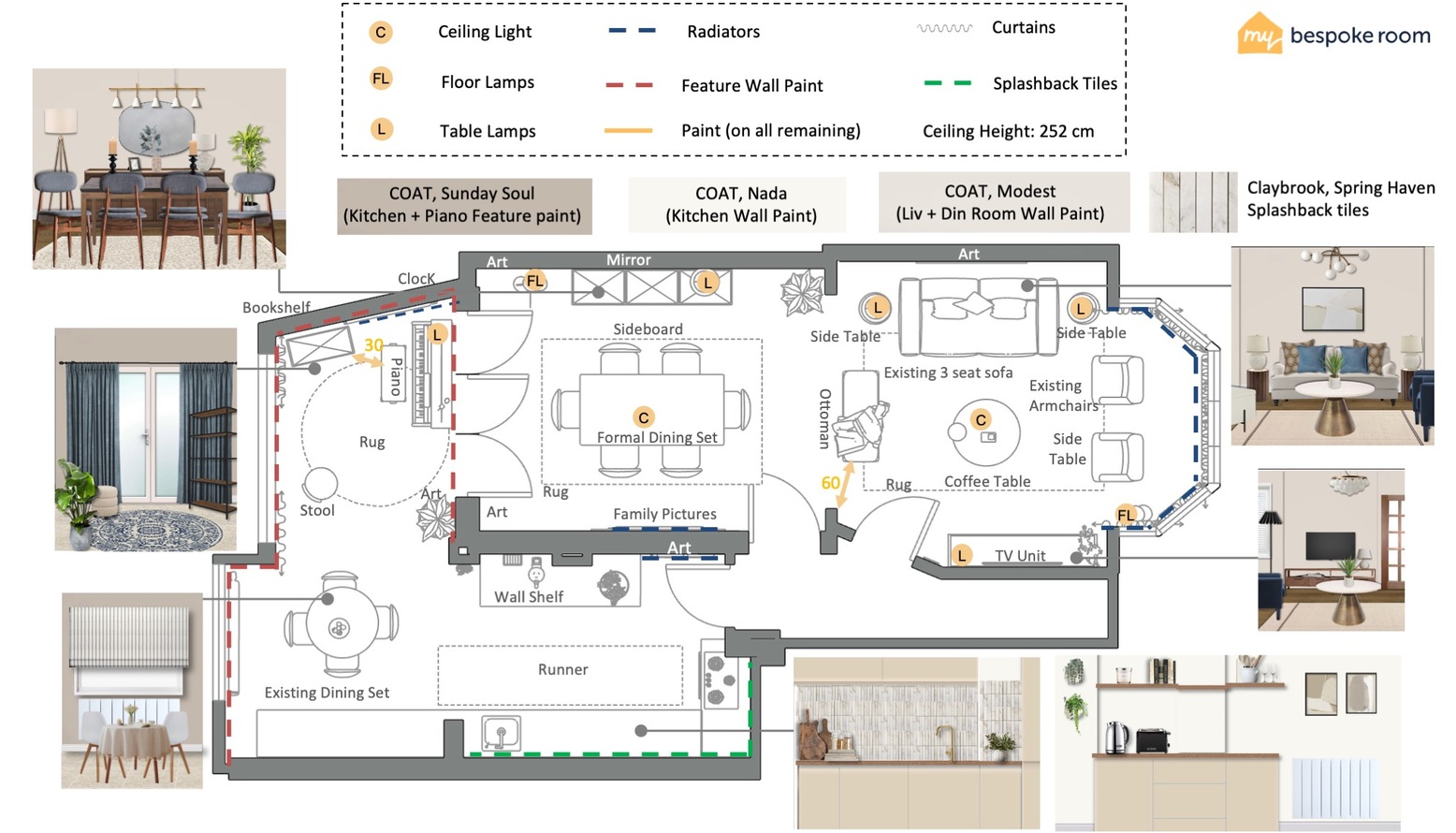 I have suggested art for above the sofa, for the kitchen above the radiator, and for the piano room. The existing artwork in the dining room wall where the triple door is I would suggest to keep as it goes well with the scheme.