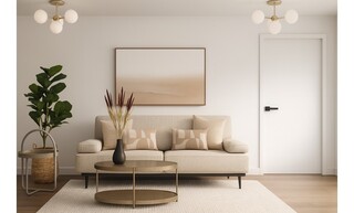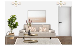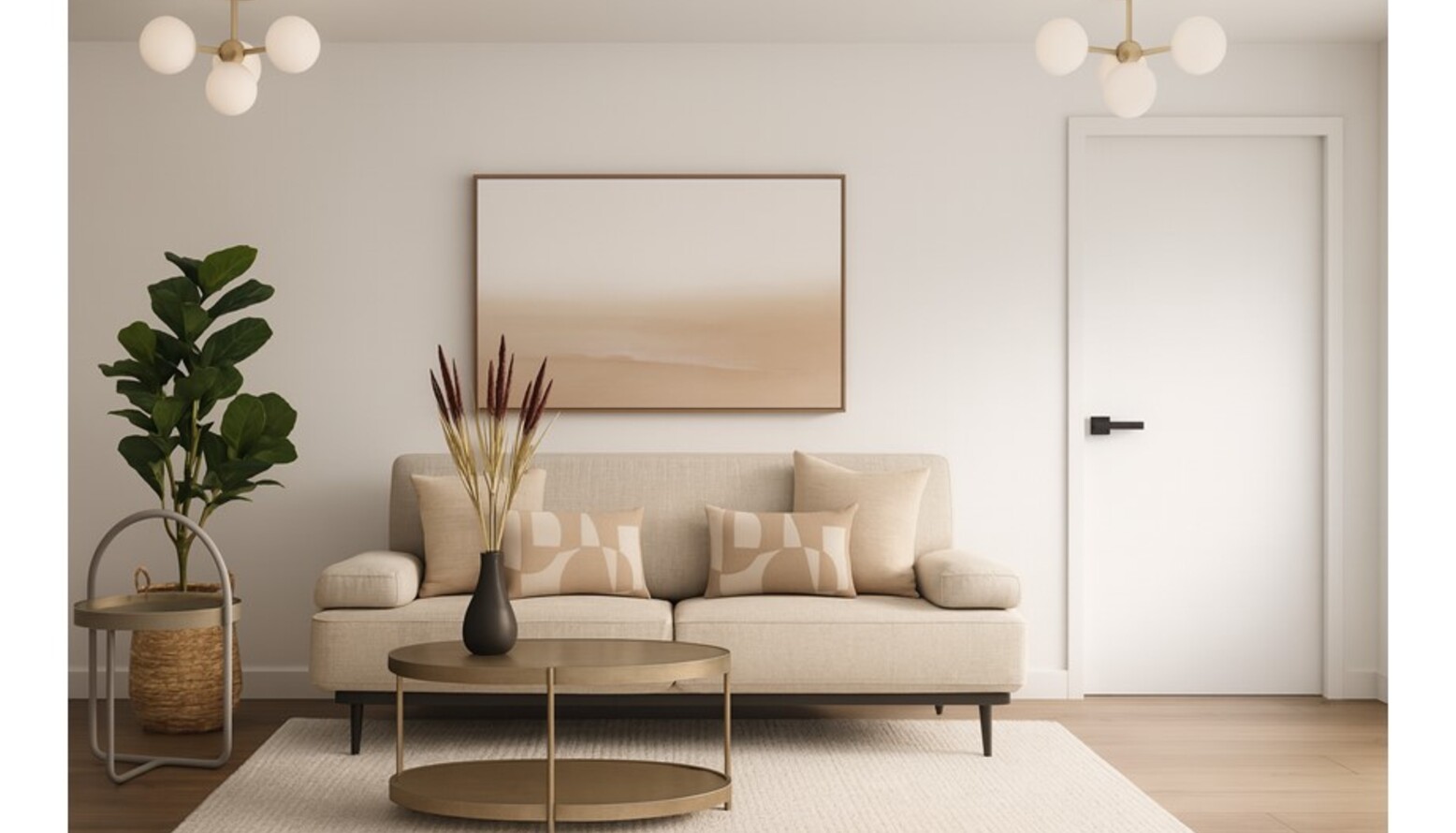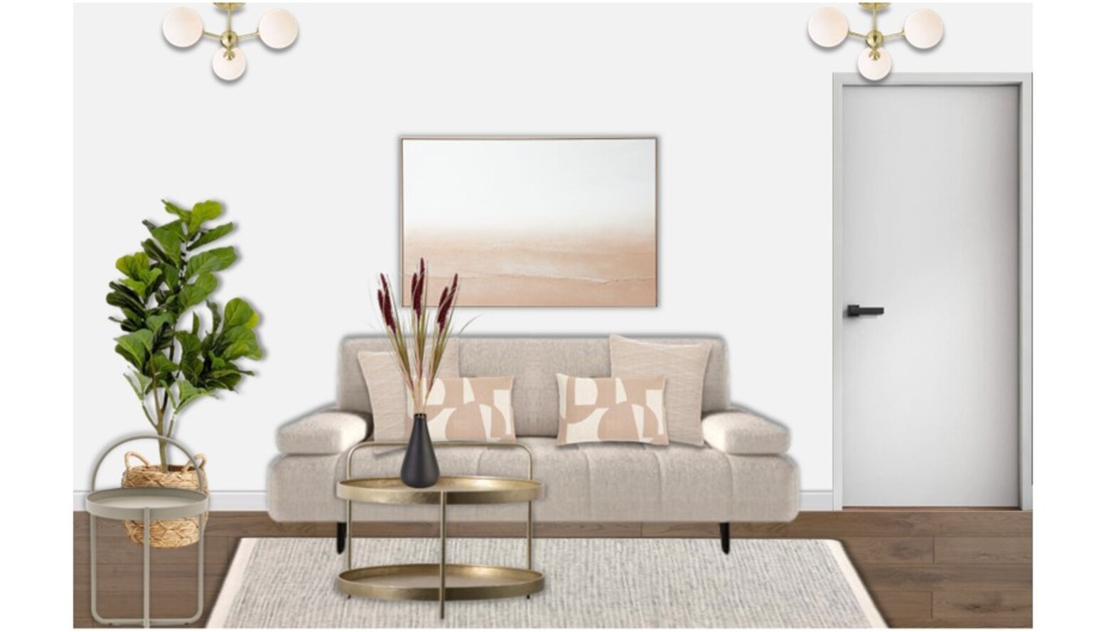 A cozy beige sofa adorned with patterned cushions is the focal point, providing comfort and style. Complementing the sofa is a chic gold coffee table, central to the seating arrangement, and surrounded by a plush beige rug that softens the hardwood floor.