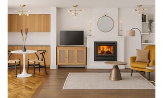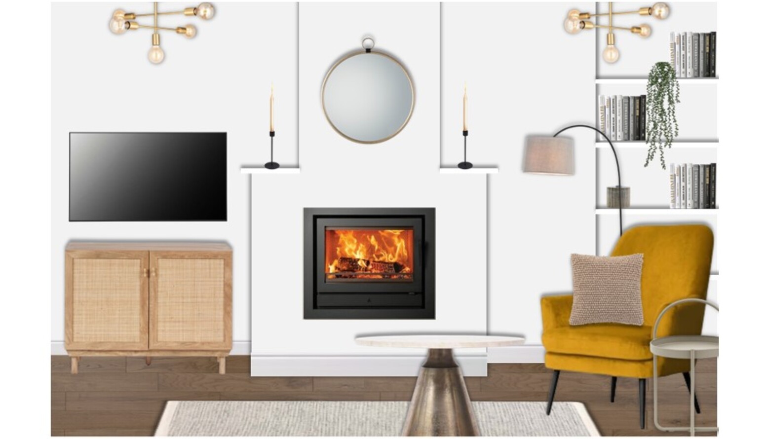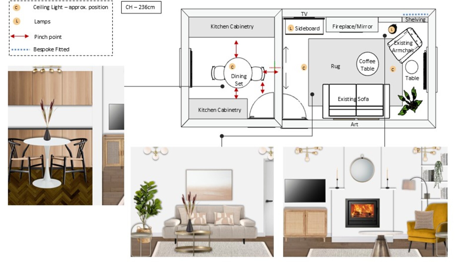 Lighting is thoughtfully incorporated with a striking gold ceiling light fixture that casts a warm glow, while an arc floor lamp adds a sculptural touch in the corner.
