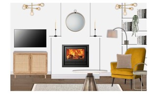 Additional elements such as a tall black metal bookcase provide functional storage without compromising style. Decorative accessories, including a vase with grass stems and intricate cushion covers, enhance the room's personality.