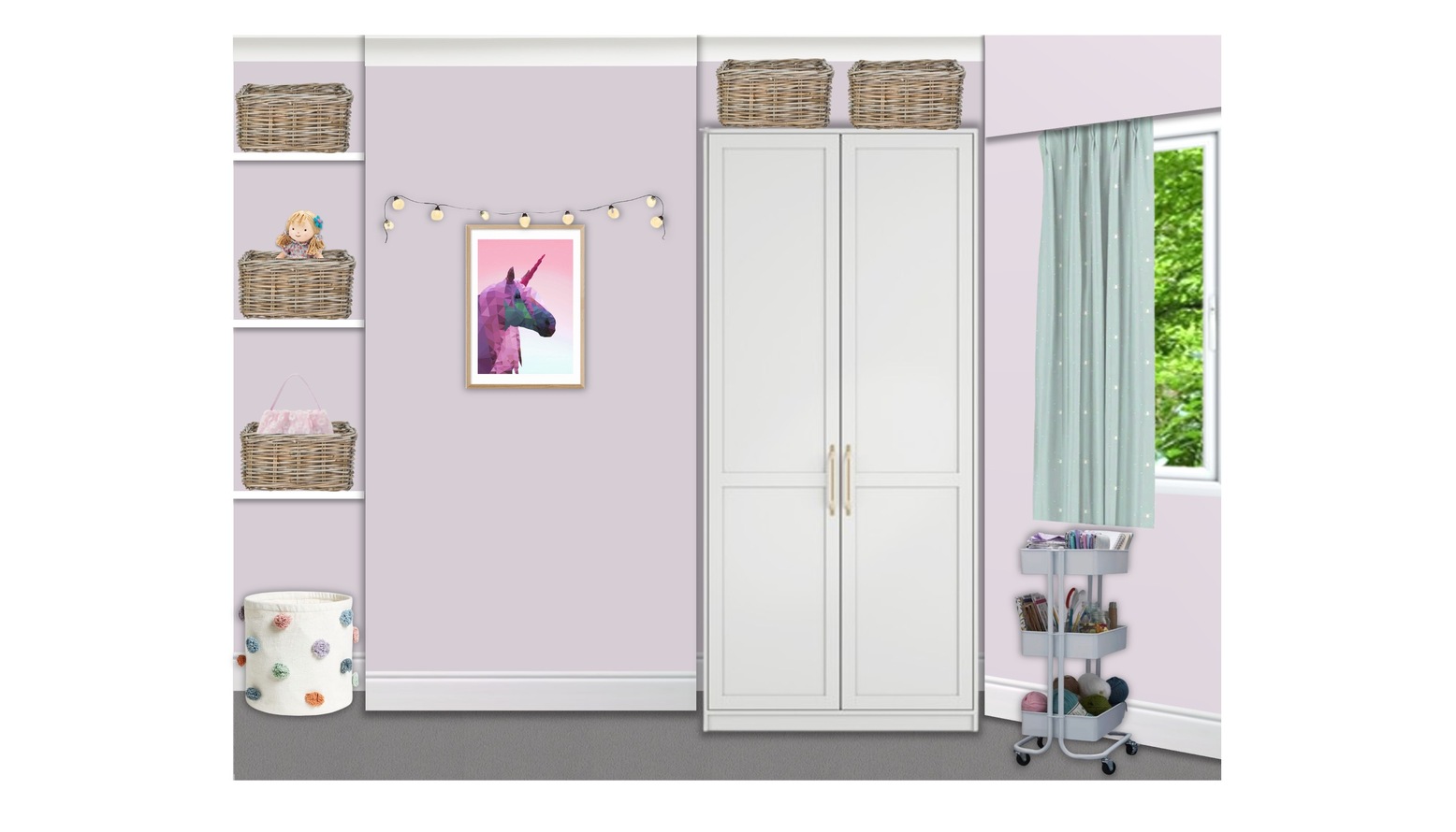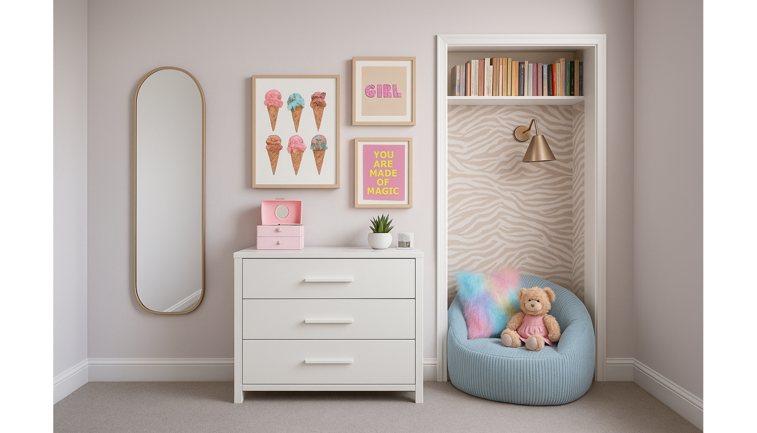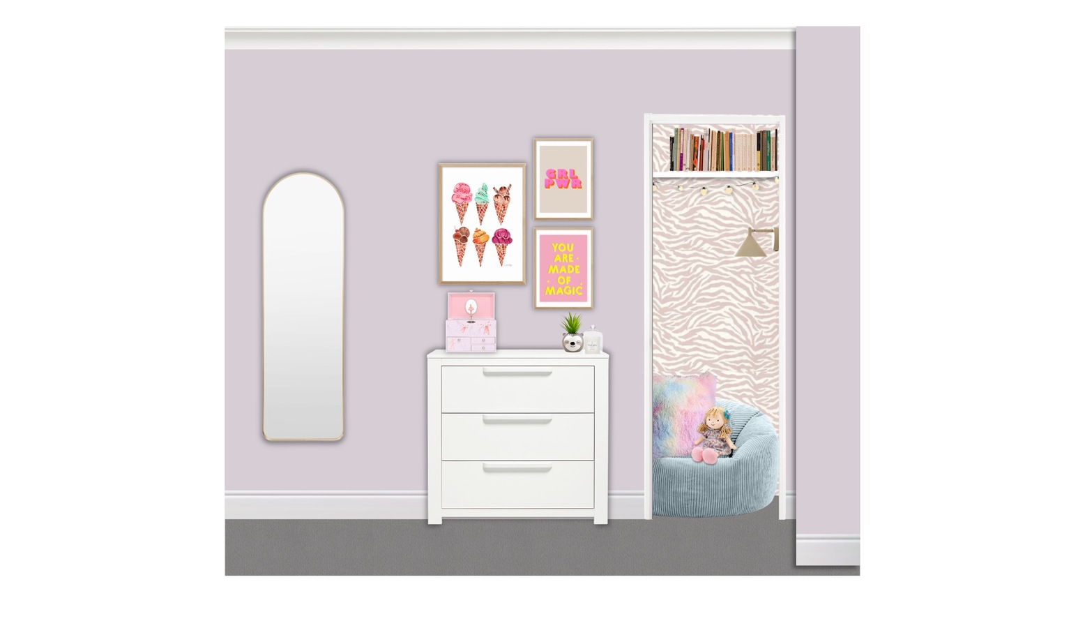 Storage options include a rattan basket for toys and a stylish grey kubu rattan square storage basket, helping to keep the room organized. An arch mirror in a gold finish complements the decor, adding both style and depth.