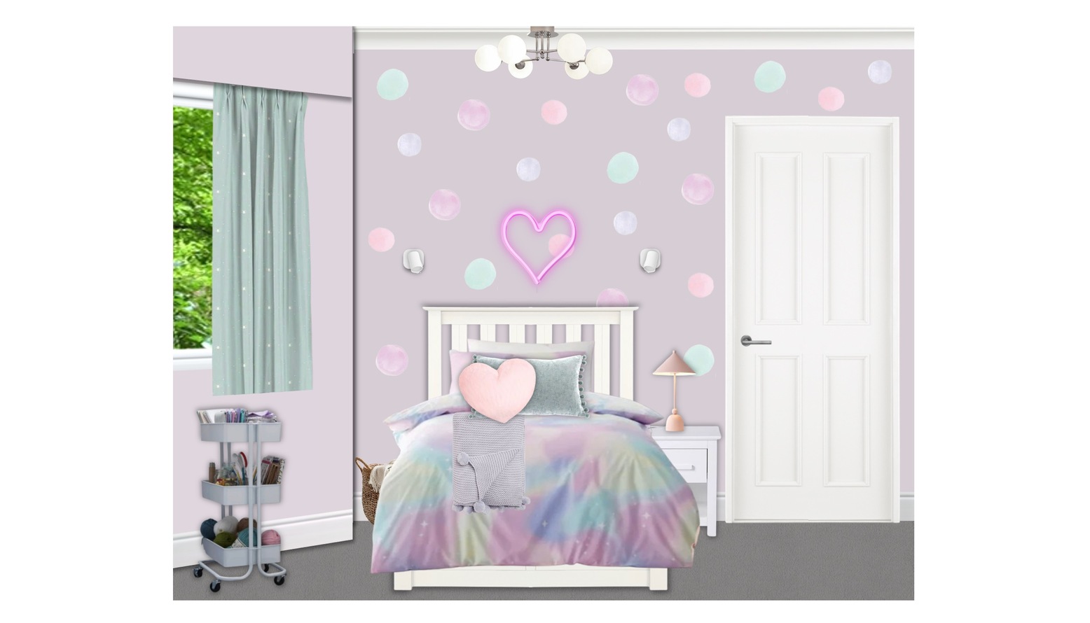 This charming children's bedroom is designed with a whimsical and cozy atmosphere. The walls are painted in a soft lavender hue, adorned with playful polka dots in pastel shades of pink and mint green, giving the room a cheerful vibe.