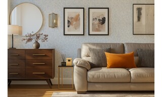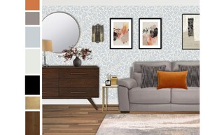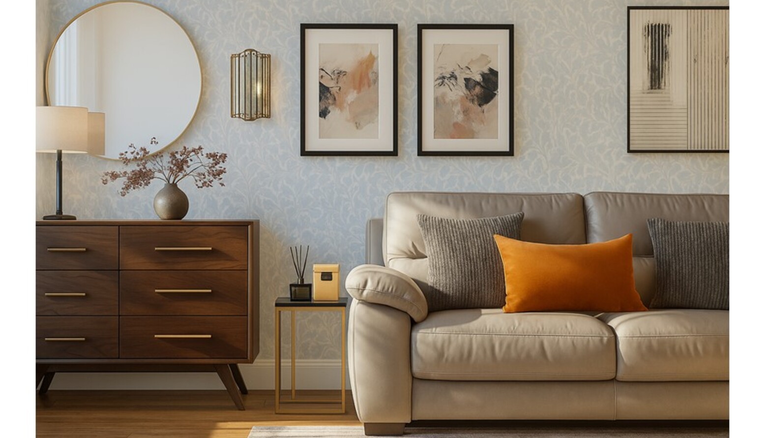 This living room design features a harmonious blend of contemporary and inviting elements. The soft, muted background is adorned with a delicate floral wallpaper, giving the space a light and airy feel. A plush, light gray leather sofa is central to the arrangement, accented with striped and velvet cushions in gray and auburn hues, adding warmth and texture. Adjacent to the sofa is a sleek wooden console with a rich walnut finish, which boasts golden hardware, echoing the brushed gold accents throughout the room. On this console, a stylish round wall mirror enhances brightness and creates a sense of spaciousness. A chic matte black table lamp, beside the mirror, adds a soft glow in the evening hours. Art pieces hung on the walls provide visual interest, featuring abstract designs in soft pinks and blacks, framed in elegant black frames. A set of round coasters in a blend of white, gray marble, and mango wood complements the décor. The flooring showcases a cozy area rug with a subtle design, anchoring the seating area while adding another layer of comfort. Functional elements such as a storage shelf unit add practicality without compromising style. Overall, the room radiates a sophisticated yet relaxed atmosphere, perfect for lounging or entertaining guests.