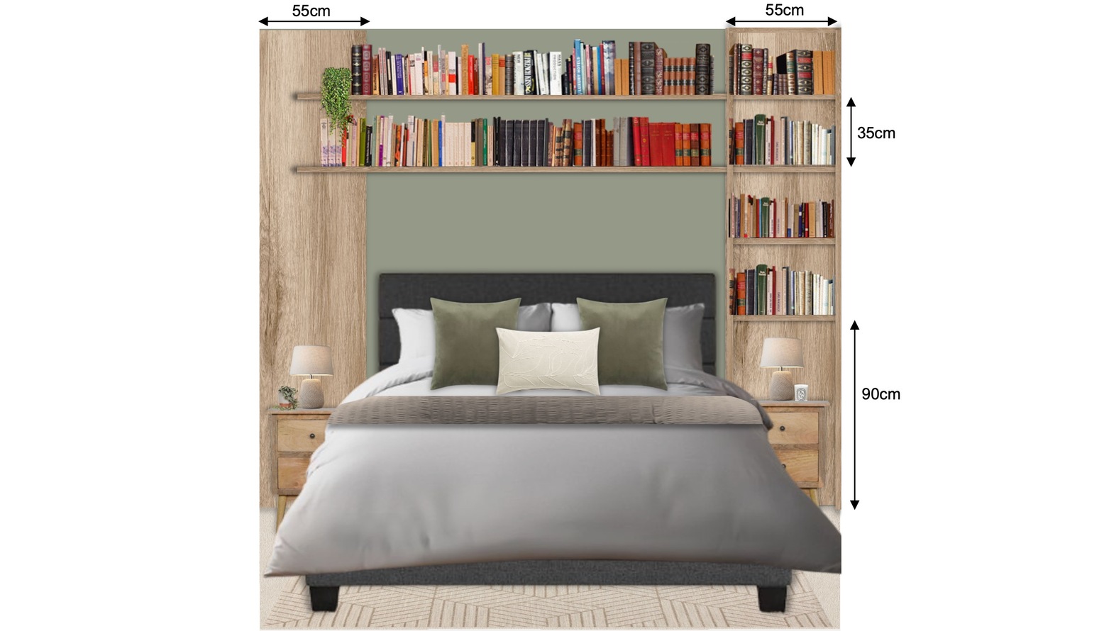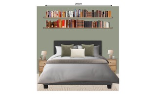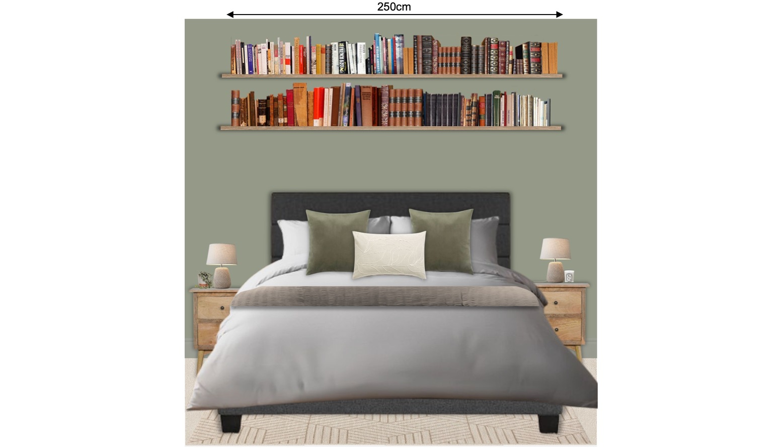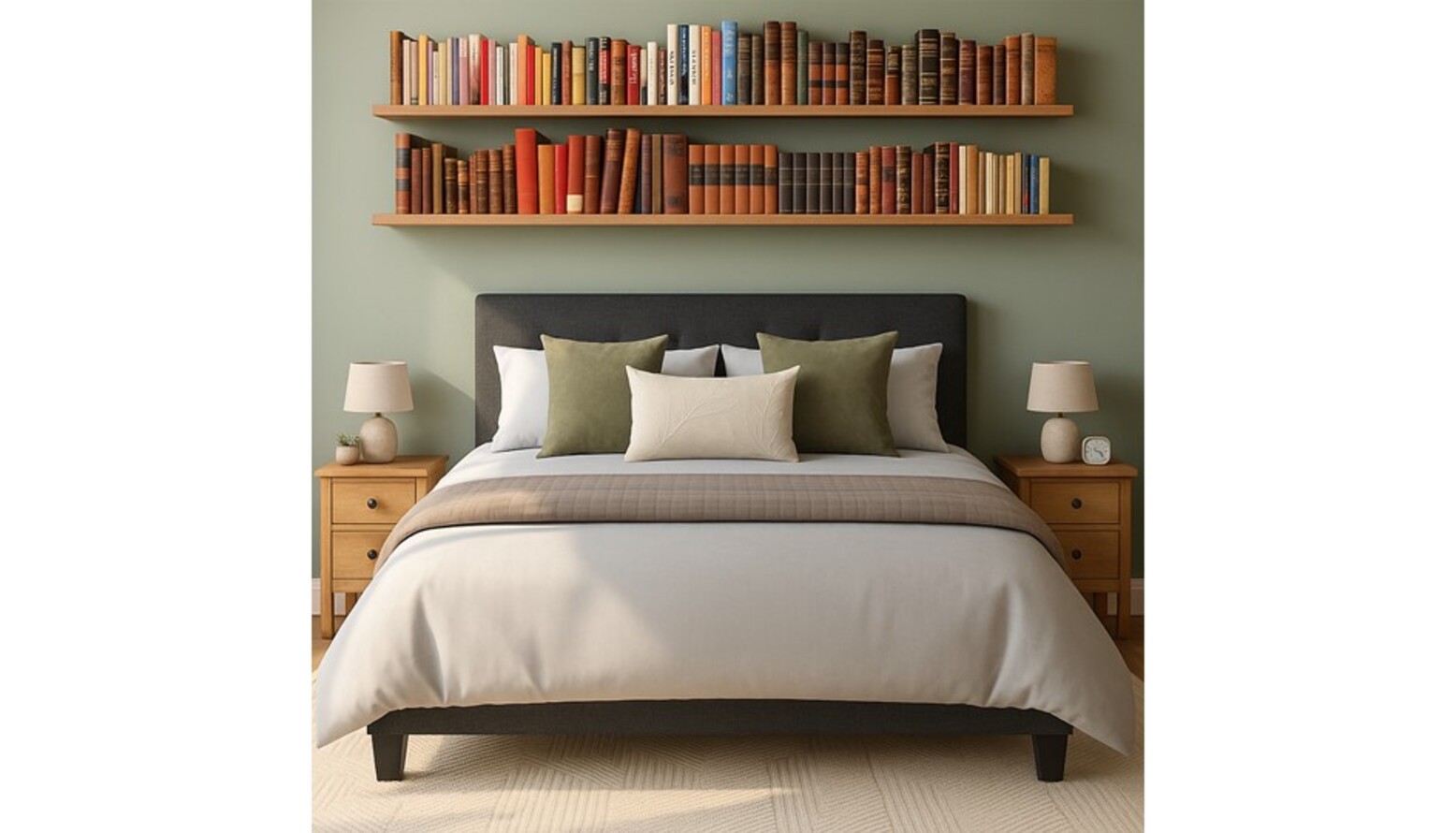 Above the bed, a long floating shelf displays a collection of books in various colors, adding personality and warmth to the room. The arrangement of books creates a visually striking piece that also serves as functional storage.