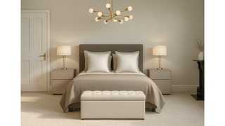 Flanking the bed, two sleek bedside tables in a light finish complement the decor. Each table supports a brushed brass lamp, providing soft, ambient lighting. Above the bed, a modern chandelier featuring multiple warm light bulbs adds a contemporary touch while enhancing the room's overall charm.
