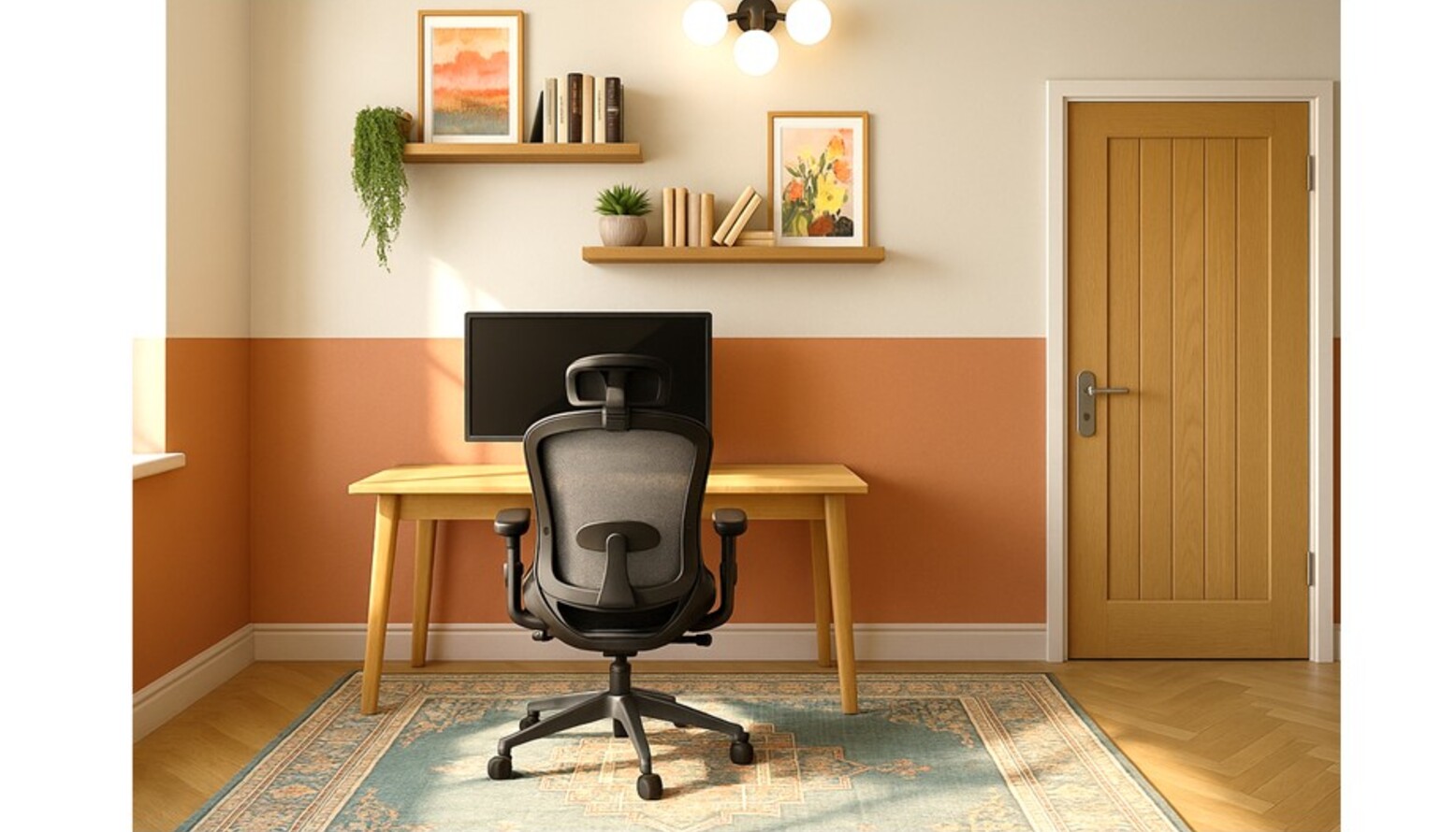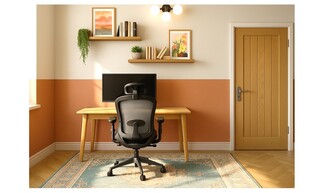 The ergonomic office chair in black offers comfort and support, perfectly positioned in front of a computer monitor. A plush area rug lies beneath the desk, introducing a soft texture and a touch of color to the hardwood floor. Generous natural light pours in through the window, enhancing the welcoming atmosphere.