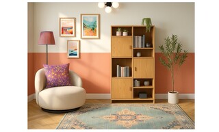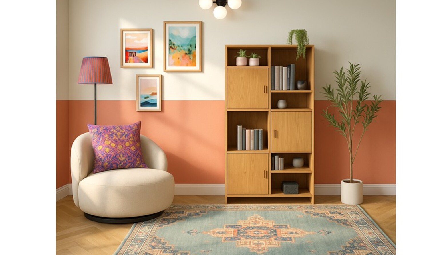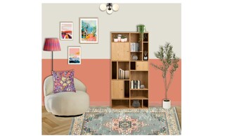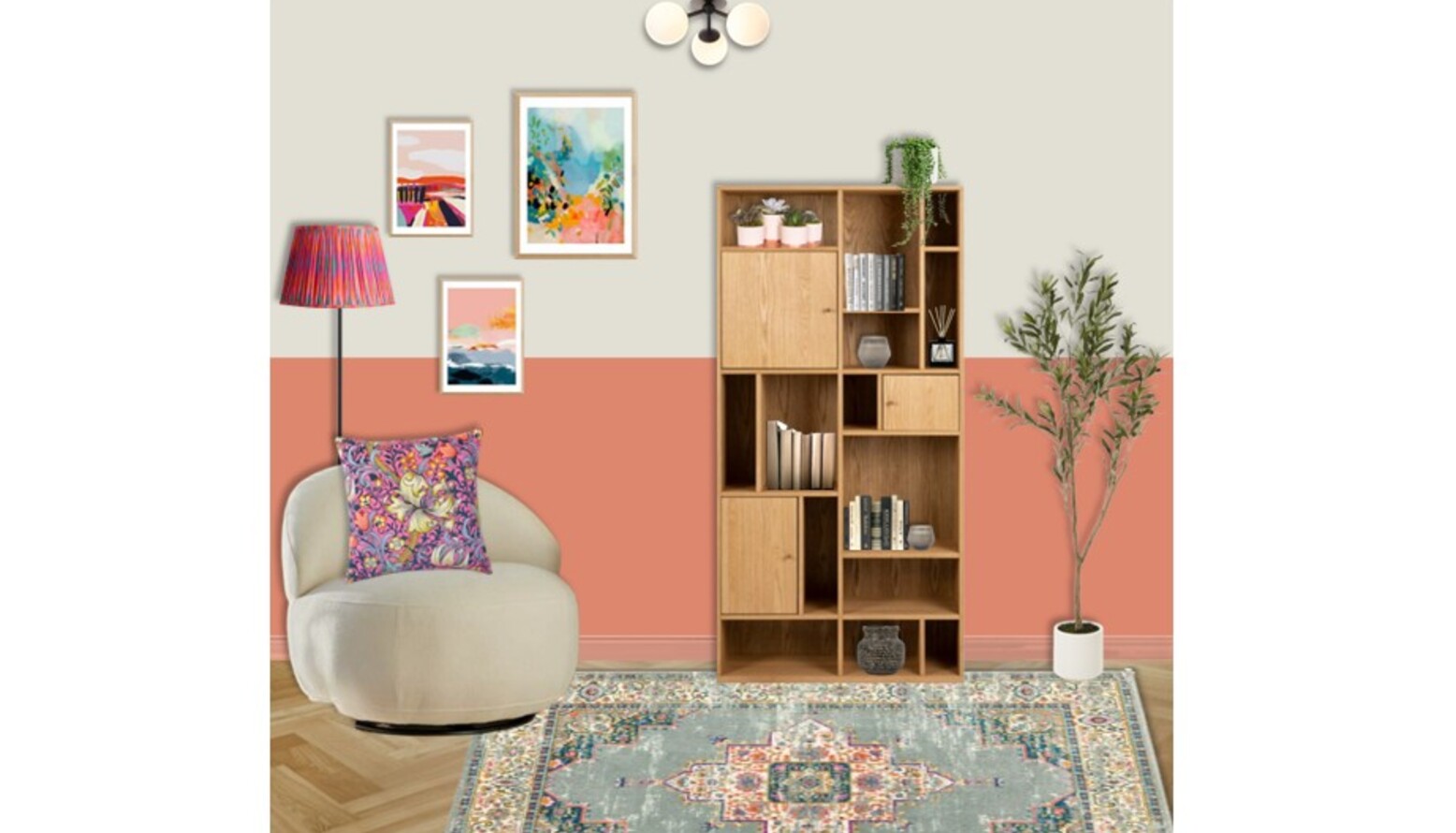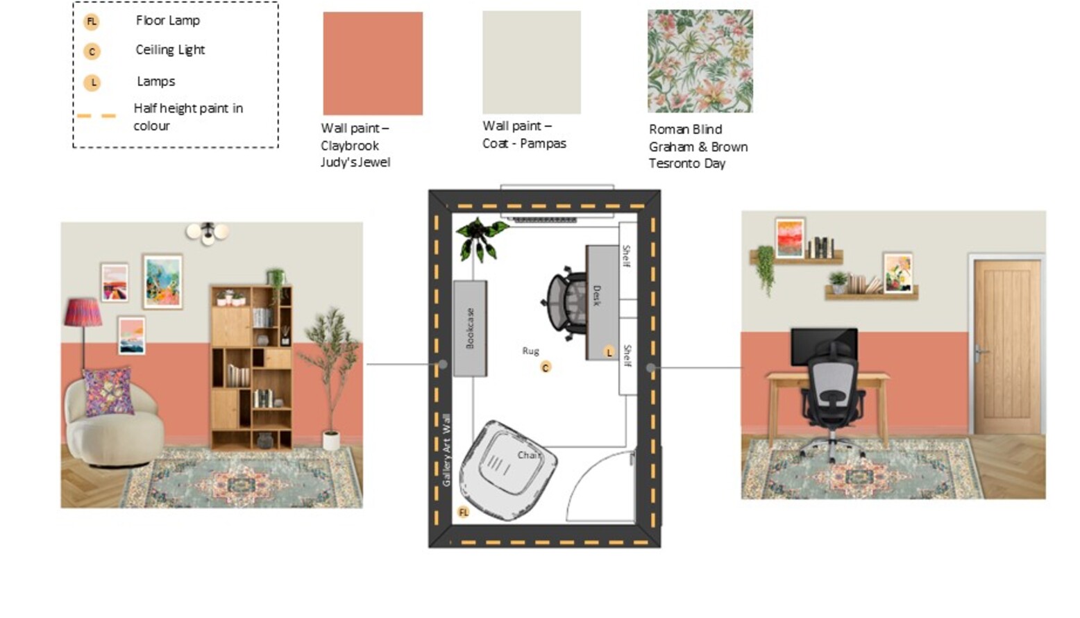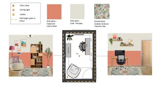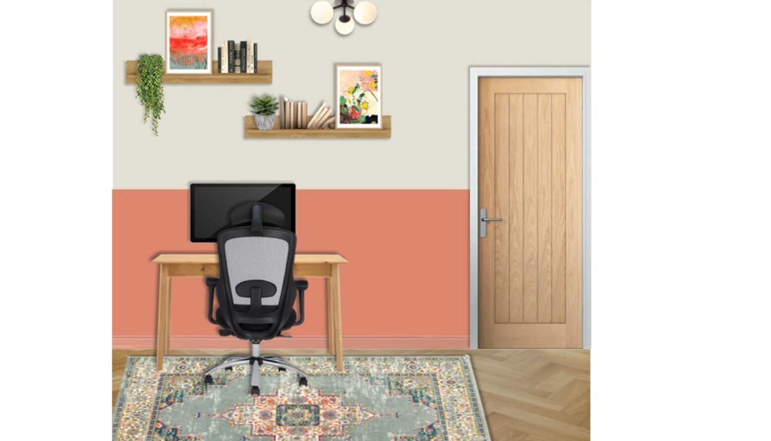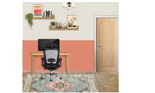 The home office features a harmonious blend of functionality and style. A light, wooden desk sits centrally against a backdrop of a warm peach accent wall, providing a designated workspace. Above the desk, two floating shelves display a small collection of books, plants, and artwork, adding character to the room.