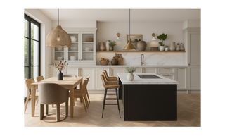 Above the table, a striking pendant light made of woven material provides a soft glow, enhancing the space's cozy vibe. Adjacent to the dining area, the kitchen showcases sleek cabinetry in soft tones paired with a marble countertop, further adding elegance.