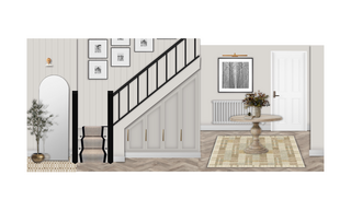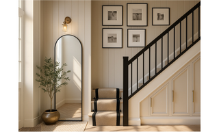 This stunning entrance hallway showcases an elegant combination of functionality and style. The walls are adorned with soft, neutral paneling, creating a warm and inviting atmosphere. A well-placed arch floor mirror reflects light, enhancing the sense of space.