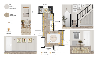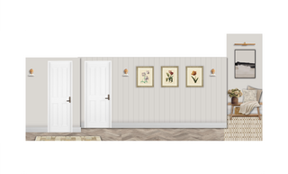 You could use wall lights instead of the picture lights if you prefer a more general light in the hallway, and frame art pieces or place it above the art piece if you have enough height. The picture light you place above an art piece if you prefer to highlight the piece. I place them in the design with the intention of highlighting certain pieces, but feel free to tweak this to better suit how you're going to use the space on a daily!