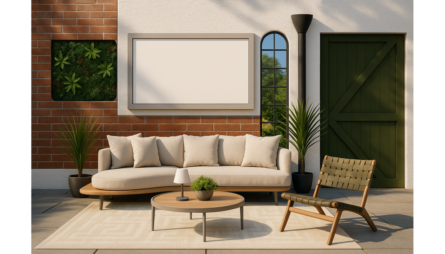 The terrace features a contemporary garden setup highlighted by a soft, natural color palette. A sleek, modern sofa serves as the central seating arrangement, upholstered in light cream fabric, paired with stylish cushions that add a vibrant pop of cayenne. A round wooden coffee table sits elegantly in front, complemented by a minimalist lamp that provides ambient lighting. The adjacent seating includes a unique folding chair with an earthy green and beige design, enhancing the outdoor experience. Lush greenery is integrated into the design with existing plants in sleek pots, along with a living wall panel featuring artificial foliage, seamlessly blending the natural with the contemporary. The background is adorned with a combination of a textured brick wall and a contrasting, rich green door, offering an inviting atmosphere. An outdoor rug, featuring a subtle geometric pattern, anchors the space while adding comfort underfoot. Amidst these elements, an elegantly framed mirror not only reflects the surroundings but also visually expands the space, contributing to a chic and cohesive outdoor living area.