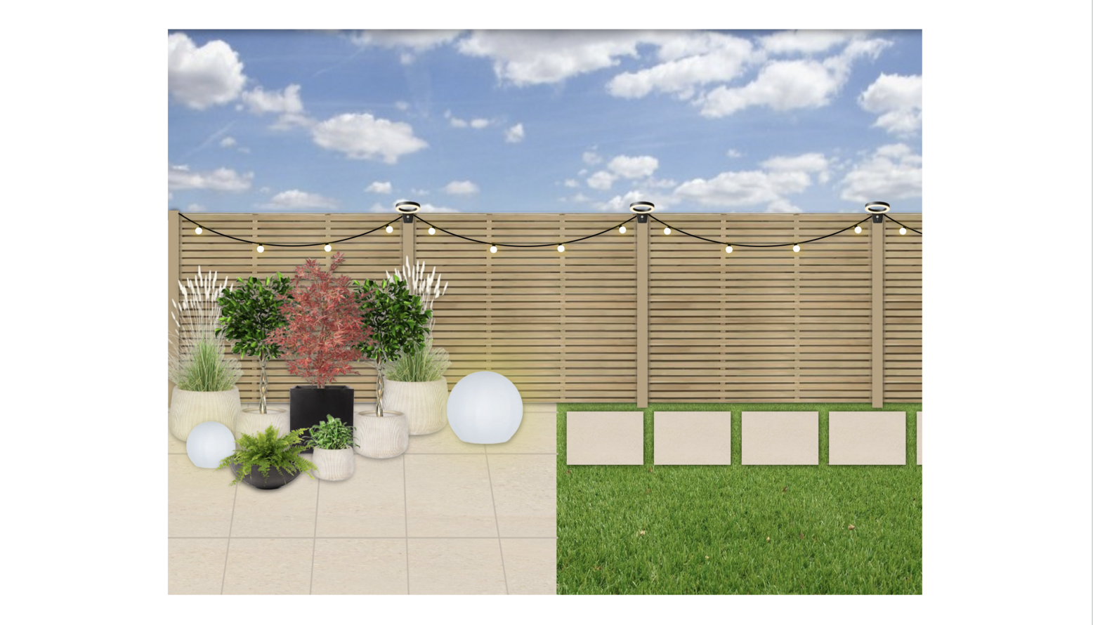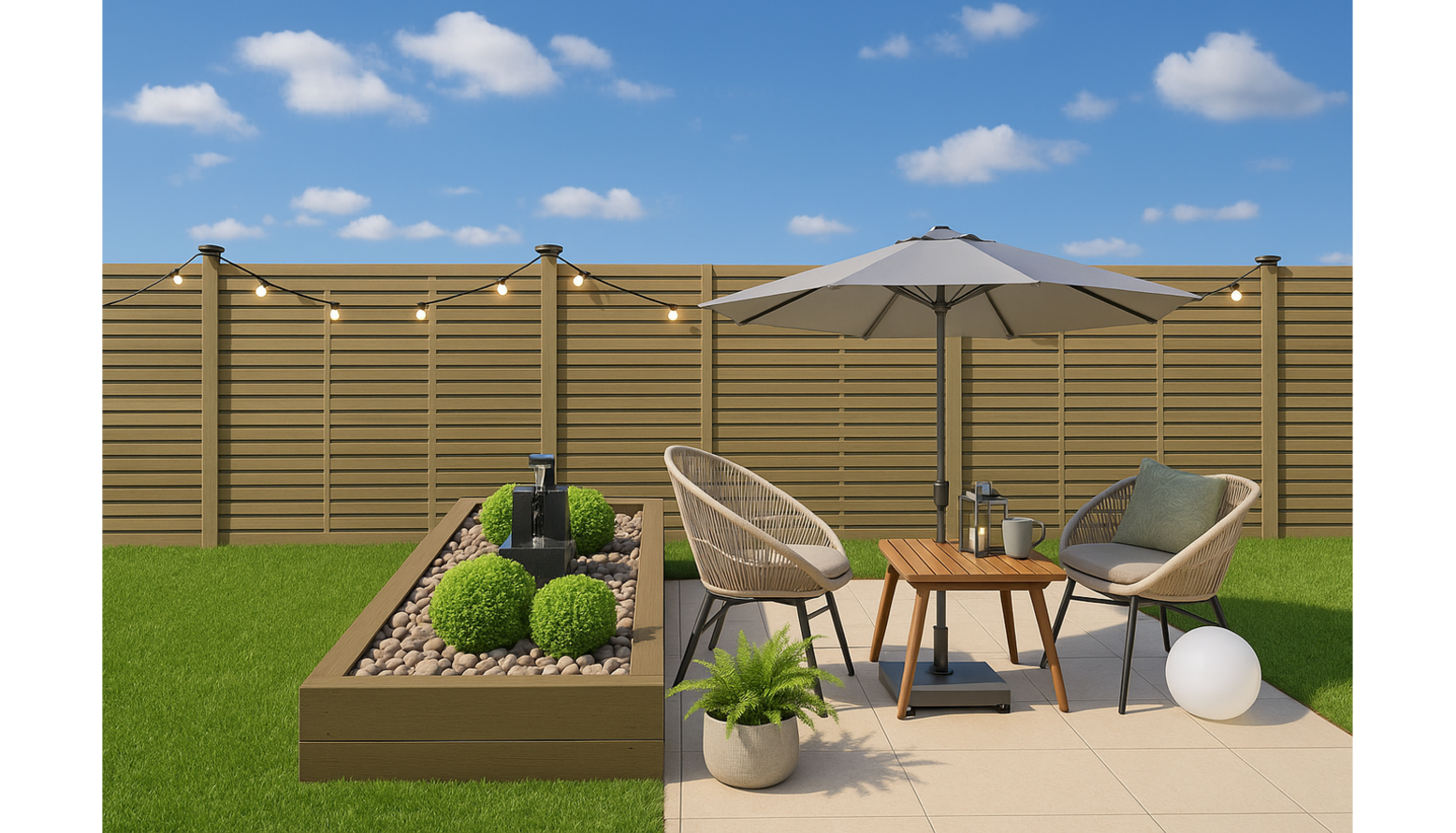 This terrace design features a lush green lawn that adds vibrancy to the outdoor space. A contemporary wooden fence encloses the area, providing privacy while harmonizing with the natural surroundings. An inviting seating area includes two stylish rattan chairs adorned with soft cushions, creating a comfortable spot for relaxation.