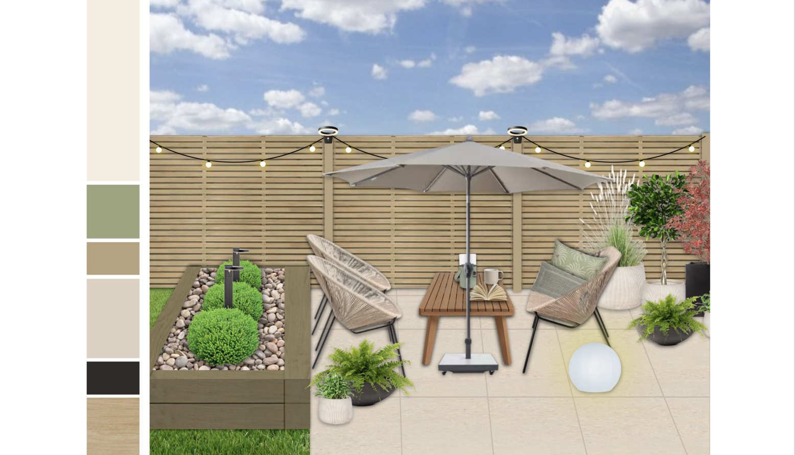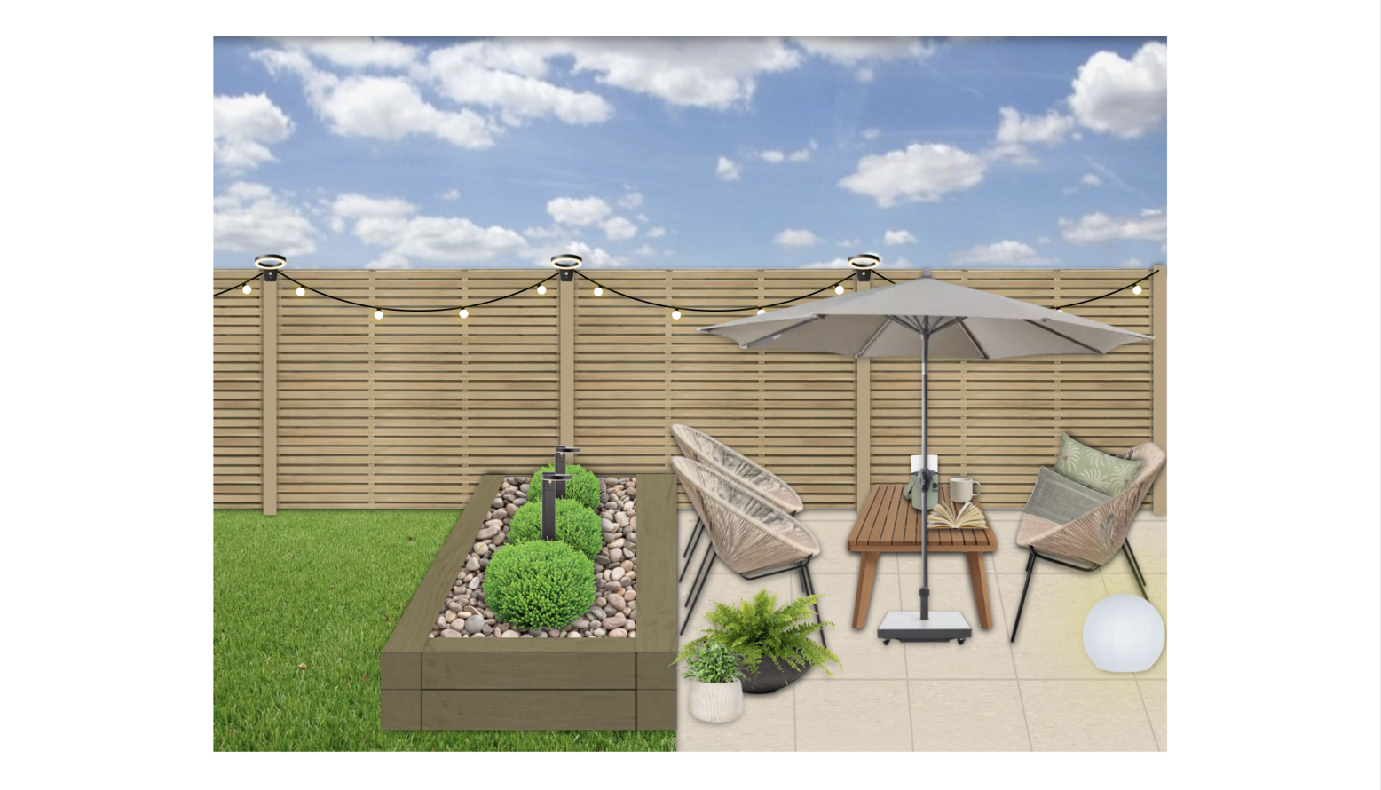 The garden is further enhanced by a raised planter, home to neatly trimmed spherical bushes and decorative pebbles, adding a touch of greenery and texture. For warmth and atmosphere, a tabletop heater stands ready to extend the outdoor season, making this terrace a delightful retreat for social gatherings or quiet moments of solitude.