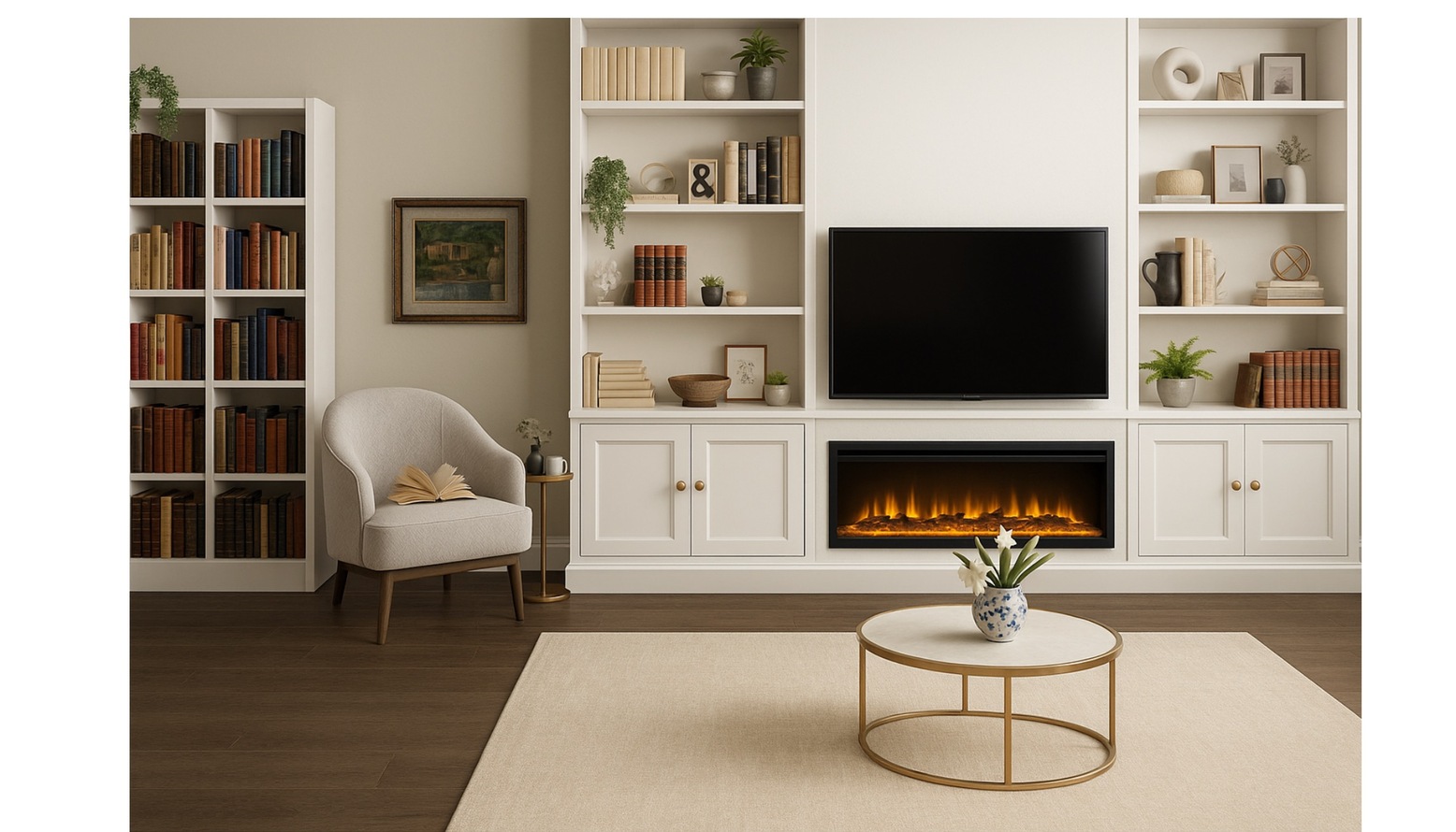 This dual-function room beautifully combines comfort and functionality, serving as both a living and office space. The rich navy blue walls create a striking backdrop, highlighting the sophistication of the space while providing a calm atmosphere.