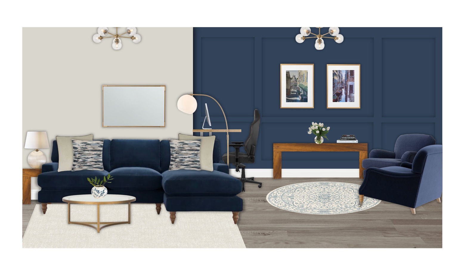 An elegant armchair in matching navy complements the sofa, creating a cozy reading nook. The workspace is defined by a wooden desk that flows seamlessly with the décor, paired with a sleek black office chair offering comfort during prolonged use.