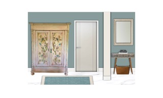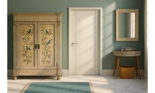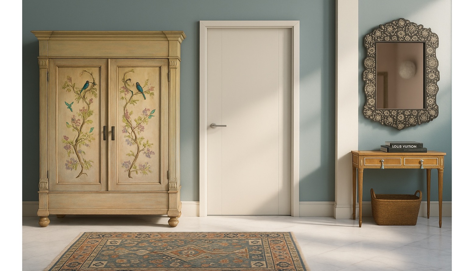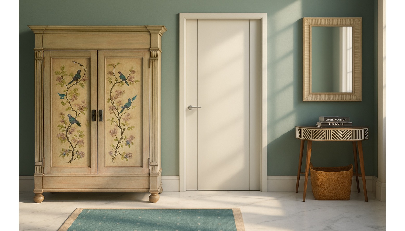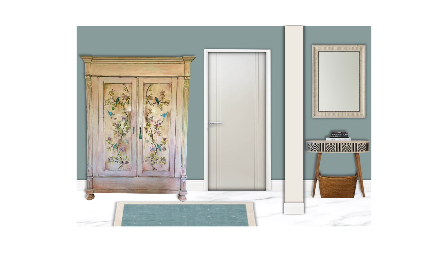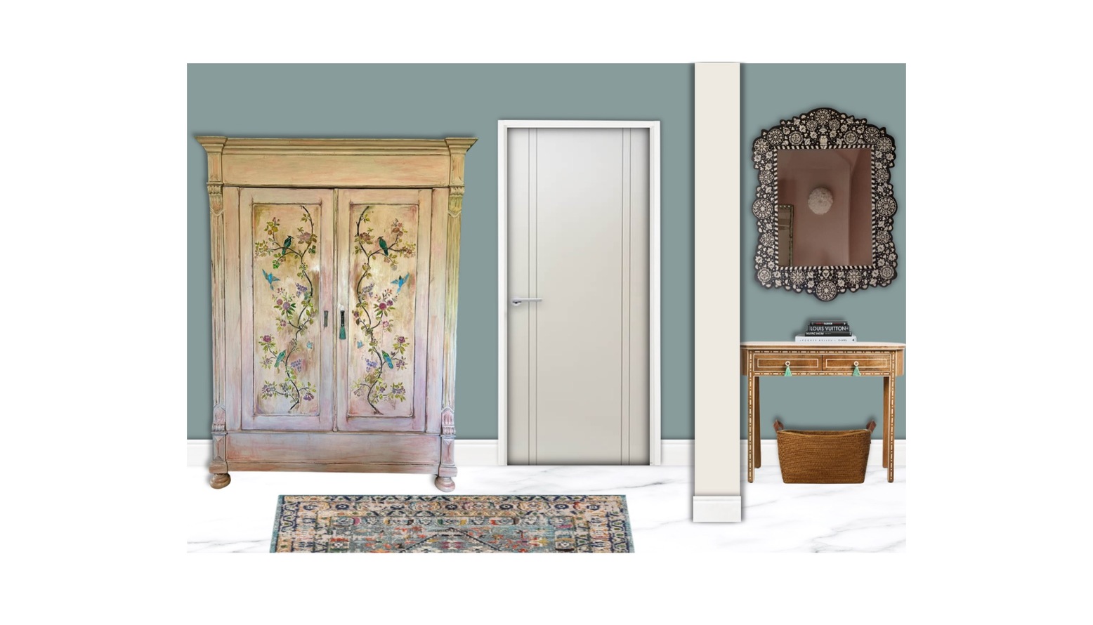 The hallway blends elegance with functionality, adorned with a serene color palette of soft greens and neutral tones. A beautifully crafted Edessa bone inlay console table occupies a welcoming position, adding a touch of artistry with its intricate design.