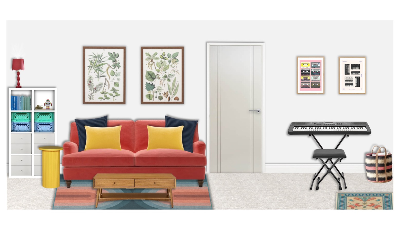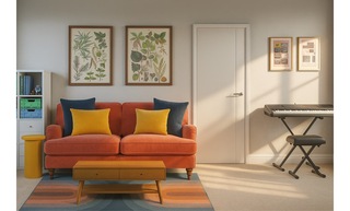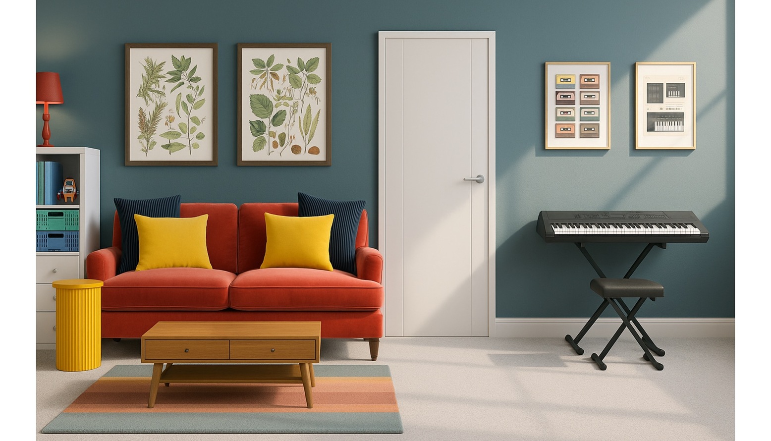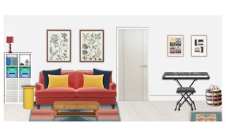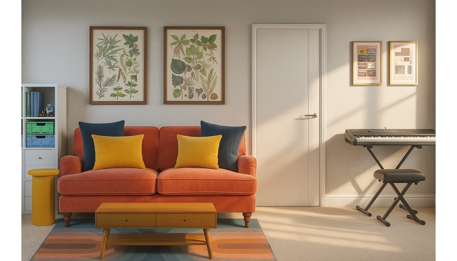 This vibrant playroom is designed as a creative and comfortable space for children. The centerpiece is a plush orange sofa adorned with a mix of soft, inviting cushions in blue and yellow hues, offering both style and comfort. A modern, ribbed yellow round side table adds a playful touch and serves as an ideal spot for snacks and games. In front of the sofa is a sleek wooden coffee table with a minimalist design, enhancing the room’s contemporary feel. The floor is covered with a multi-colored flatwoven rug that introduces an array of colors, perfectly harmonizing the overall aesthetic. Natural light streams in, showcasing framed artwork featuring leafy botanical designs that add a touch of nature to the decor. To the side, a compact shelf organizes books and toys within green and blue storage containers, promoting a tidy play environment. A tall scalloped table lamp stands elegantly beside the sofa, providing soft lighting when needed. Finally, a digital piano is positioned in the corner, encouraging creative expression and musical exploration.