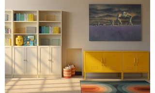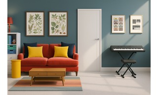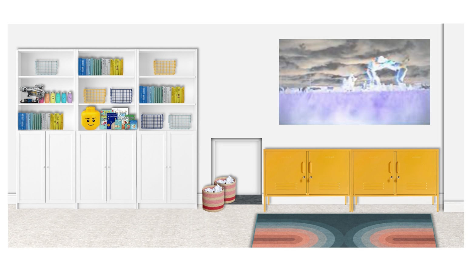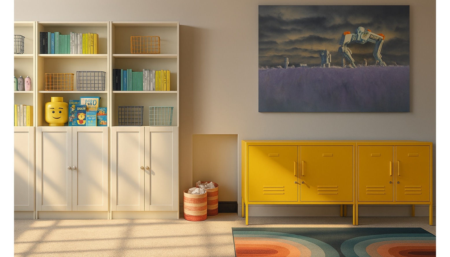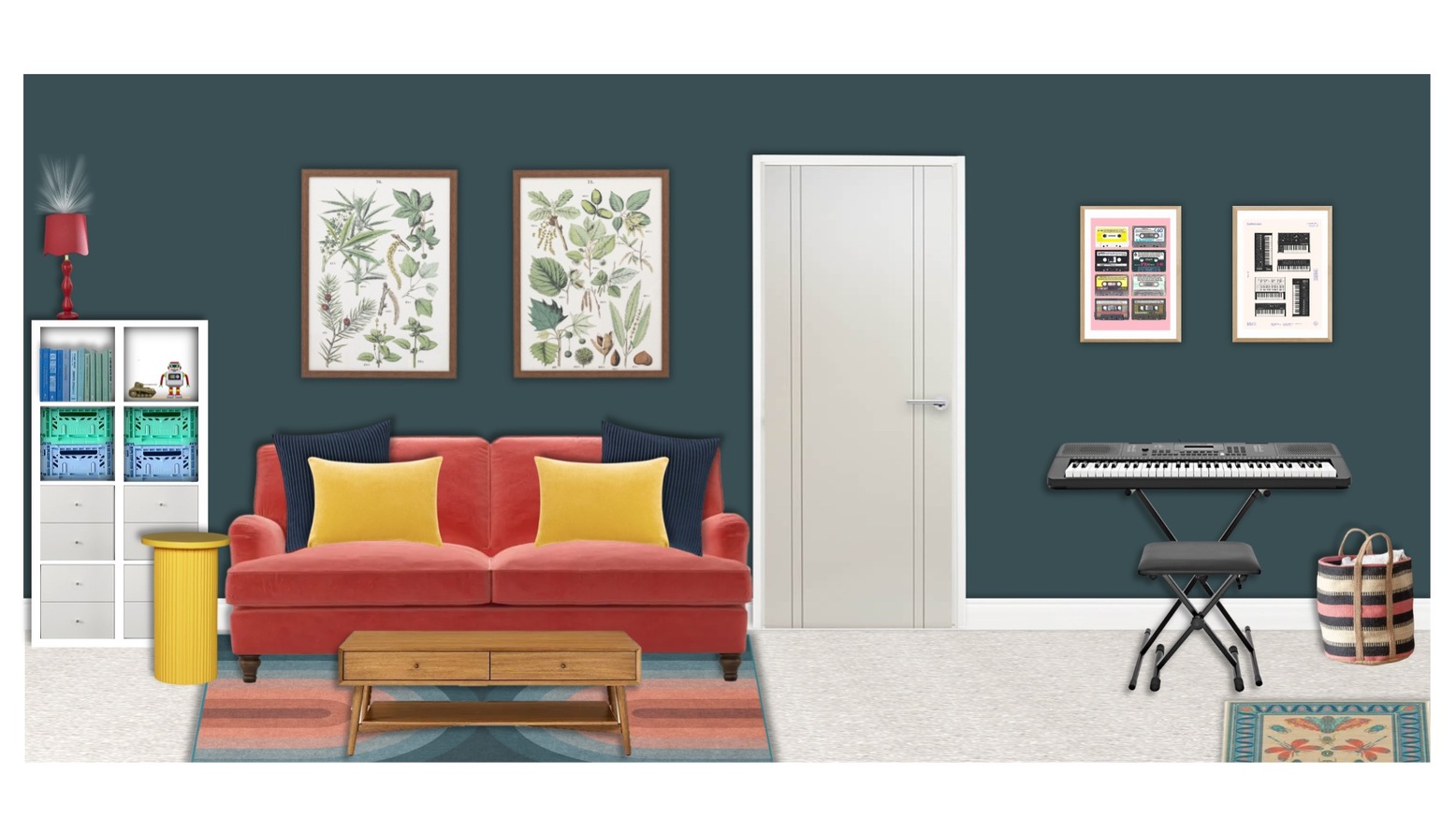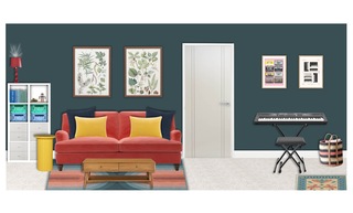 This vibrant playroom is designed as a creative and comfortable space for children. The centerpiece is a plush orange sofa adorned with a mix of soft, inviting cushions in blue and yellow hues, offering both style and comfort. A modern, ribbed yellow round side table adds a playful touch and serves as an ideal spot for snacks and games. In front of the sofa is a sleek wooden coffee table with a minimalist design, enhancing the room’s contemporary feel. The floor is covered with a multi-colored flatwoven rug that introduces an array of colors, perfectly harmonizing the overall aesthetic. Natural light streams in, showcasing framed artwork featuring leafy botanical designs that add a touch of nature to the decor. To the side, a compact shelf organizes books and toys within green and blue storage containers, promoting a tidy play environment. A tall scalloped table lamp stands elegantly beside the sofa, providing soft lighting when needed. Finally, a digital piano is positioned in the corner, encouraging creative expression and musical exploration.