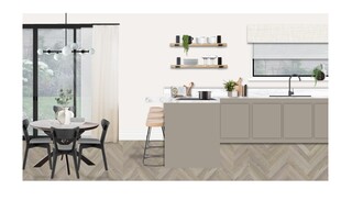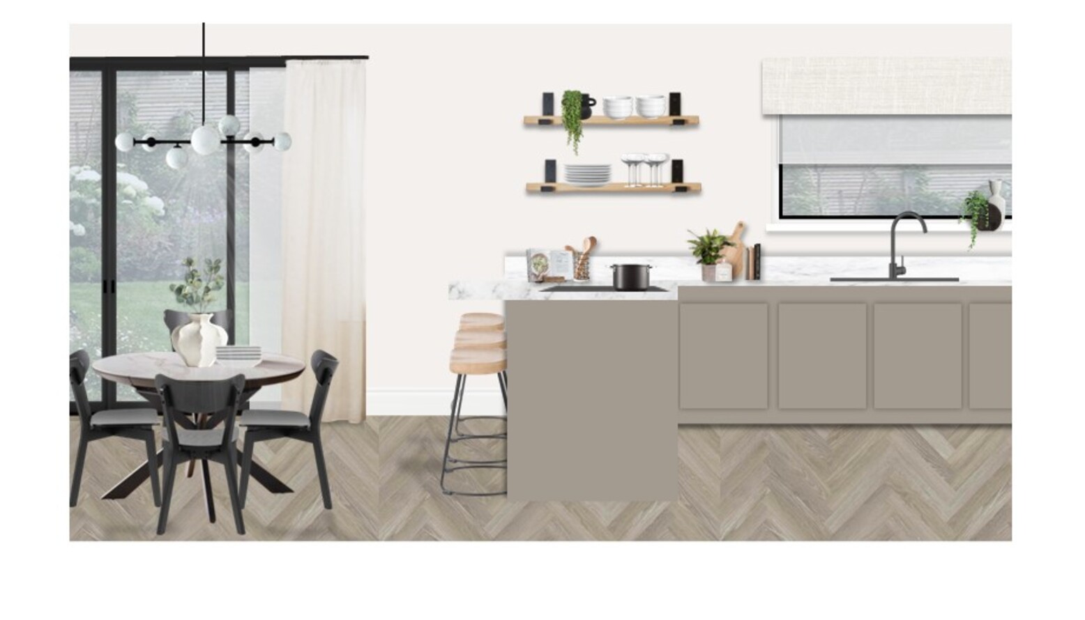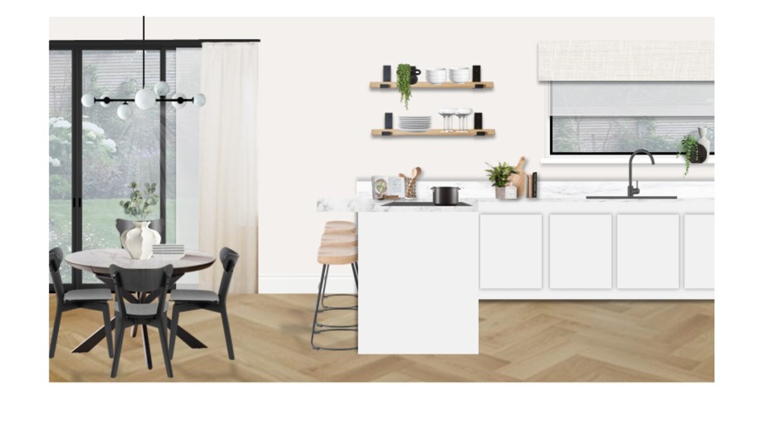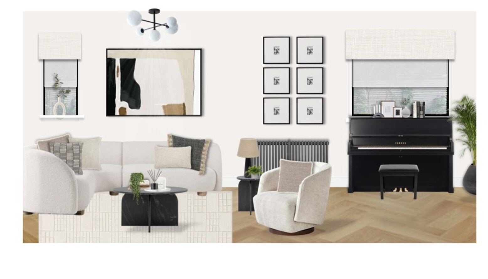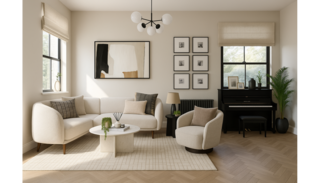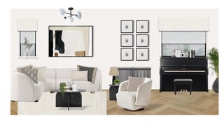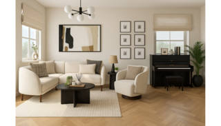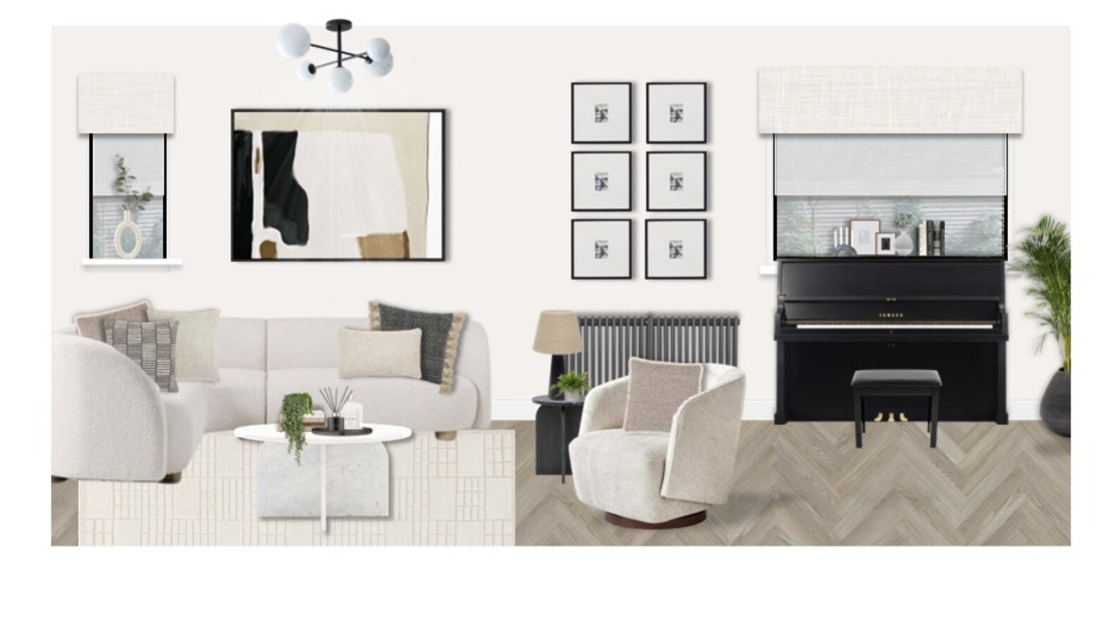 The room is a multi-functional space that elegantly combines a living area, kitchen, and dining section. A soft, inviting palette creates a warm atmosphere, complemented by natural light streaming in through the windows adorned with practical yet stylish Roman shades. At the heart of the living area, a modern, ivory-toned corner chaise sofa is accented with plush cushions, inviting relaxation and conversation. A round, textured coffee table sits prominently, adding a touch of sophistication. Nearby, a sleek accent chair provides a comfortable reading nook. The art on the wall adds character, showcasing abstract designs that harmonize with the surrounding elements. Multiple framed prints create an engaging gallery wall, drawing the eye upwards towards a contemporary light fixture with globe-shaped bulbs that casts a gentle glow. The piano stands as a functional centerpiece, an excellent blend of style and utility for musical moments. The flooring, with its herringbone pattern, adds visual interest, enhancing the overall design. Subtle indoor plants provide freshness and vitality, interspersed throughout the room. The dining area flows into the space with a stylish white ceramic round table, perfectly set for gatherings and meals. Complementary black dining chairs create contrast and balance. The overall aesthetic speaks to modern elegance, capturing a harmonious blend of comfort and contemporary style.