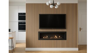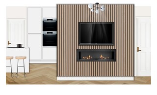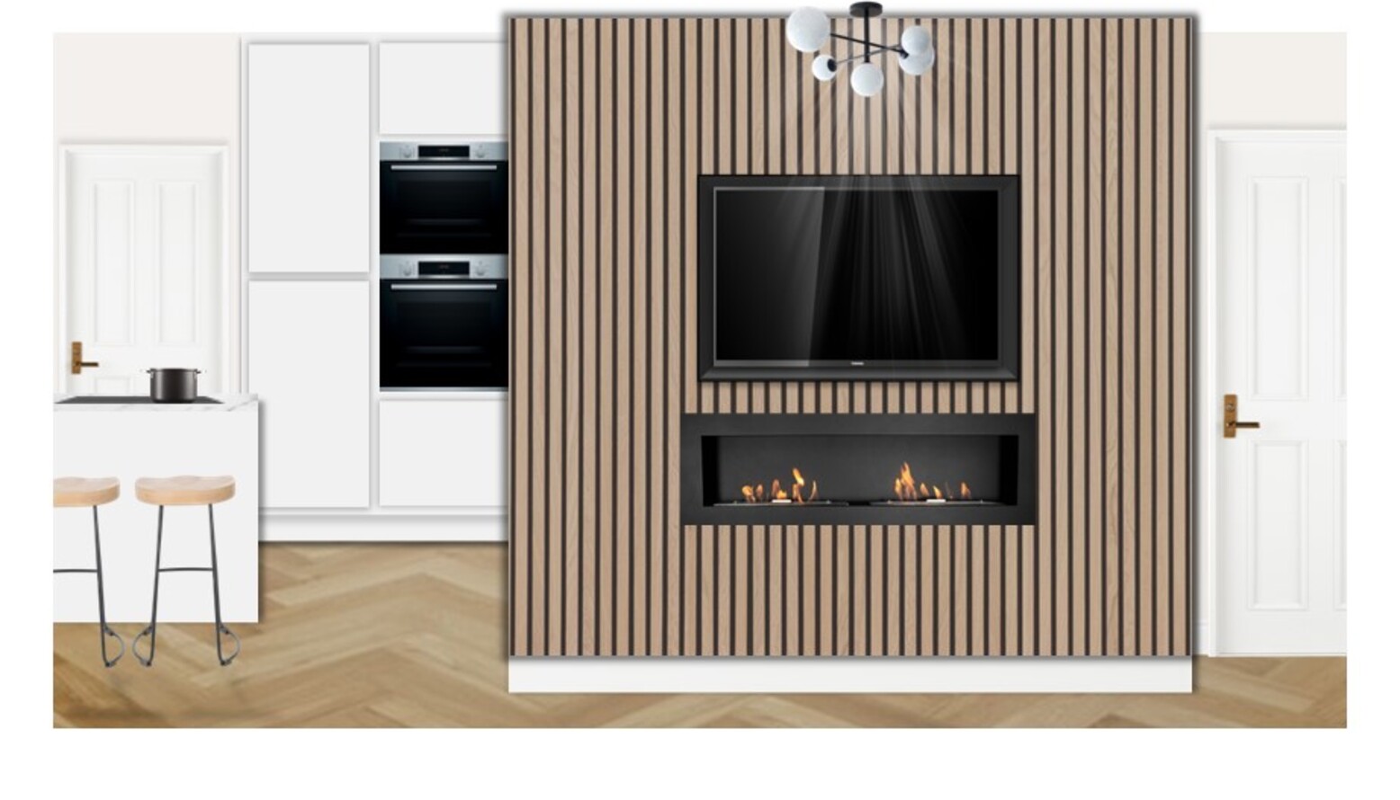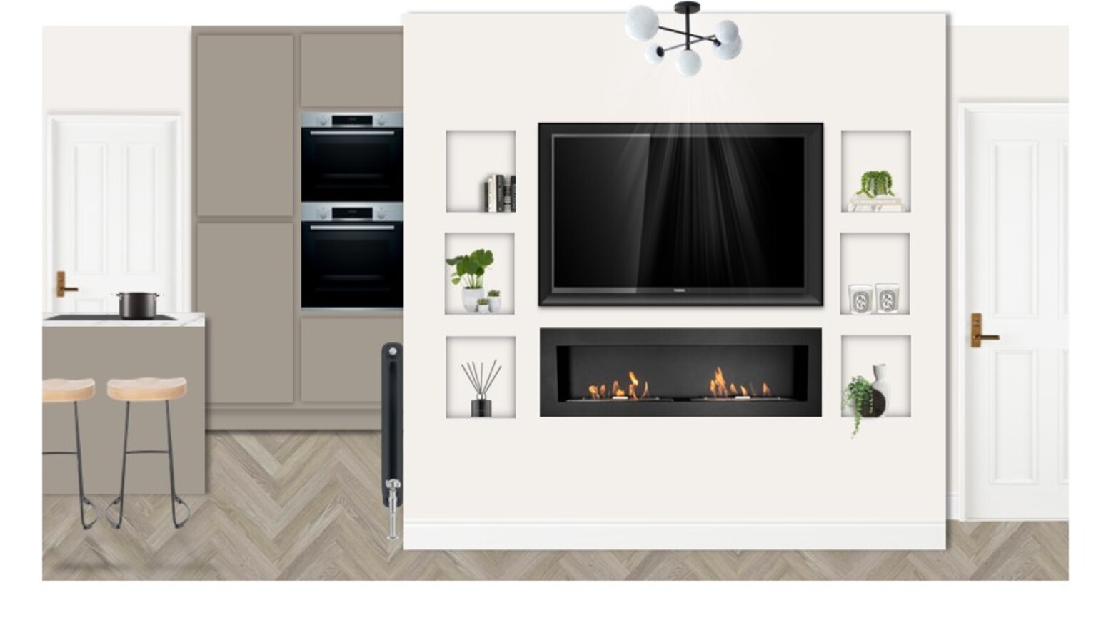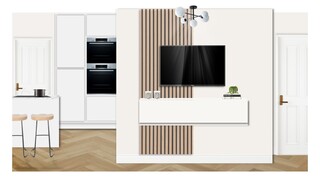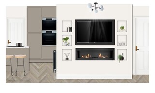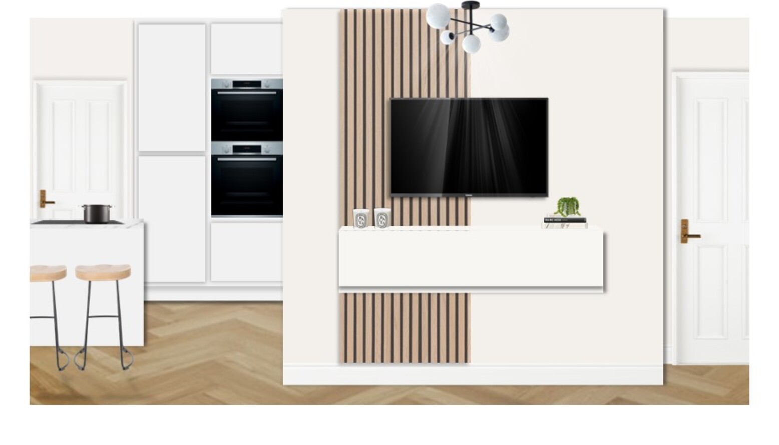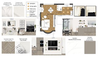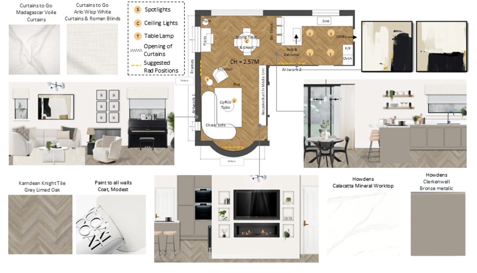 The room is a multi-functional space that elegantly combines a living area, kitchen, and dining section. A soft, inviting palette creates a warm atmosphere, complemented by natural light streaming in through the windows adorned with practical yet stylish Roman shades. At the heart of the living area, a modern, ivory-toned corner chaise sofa is accented with plush cushions, inviting relaxation and conversation. A round, textured coffee table sits prominently, adding a touch of sophistication. Nearby, a sleek accent chair provides a comfortable reading nook. The art on the wall adds character, showcasing abstract designs that harmonize with the surrounding elements. Multiple framed prints create an engaging gallery wall, drawing the eye upwards towards a contemporary light fixture with globe-shaped bulbs that casts a gentle glow. The piano stands as a functional centerpiece, an excellent blend of style and utility for musical moments. The flooring, with its herringbone pattern, adds visual interest, enhancing the overall design. Subtle indoor plants provide freshness and vitality, interspersed throughout the room. The dining area flows into the space with a stylish white ceramic round table, perfectly set for gatherings and meals. Complementary black dining chairs create contrast and balance. The overall aesthetic speaks to modern elegance, capturing a harmonious blend of comfort and contemporary style.