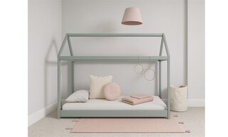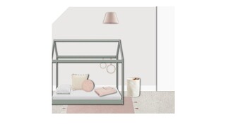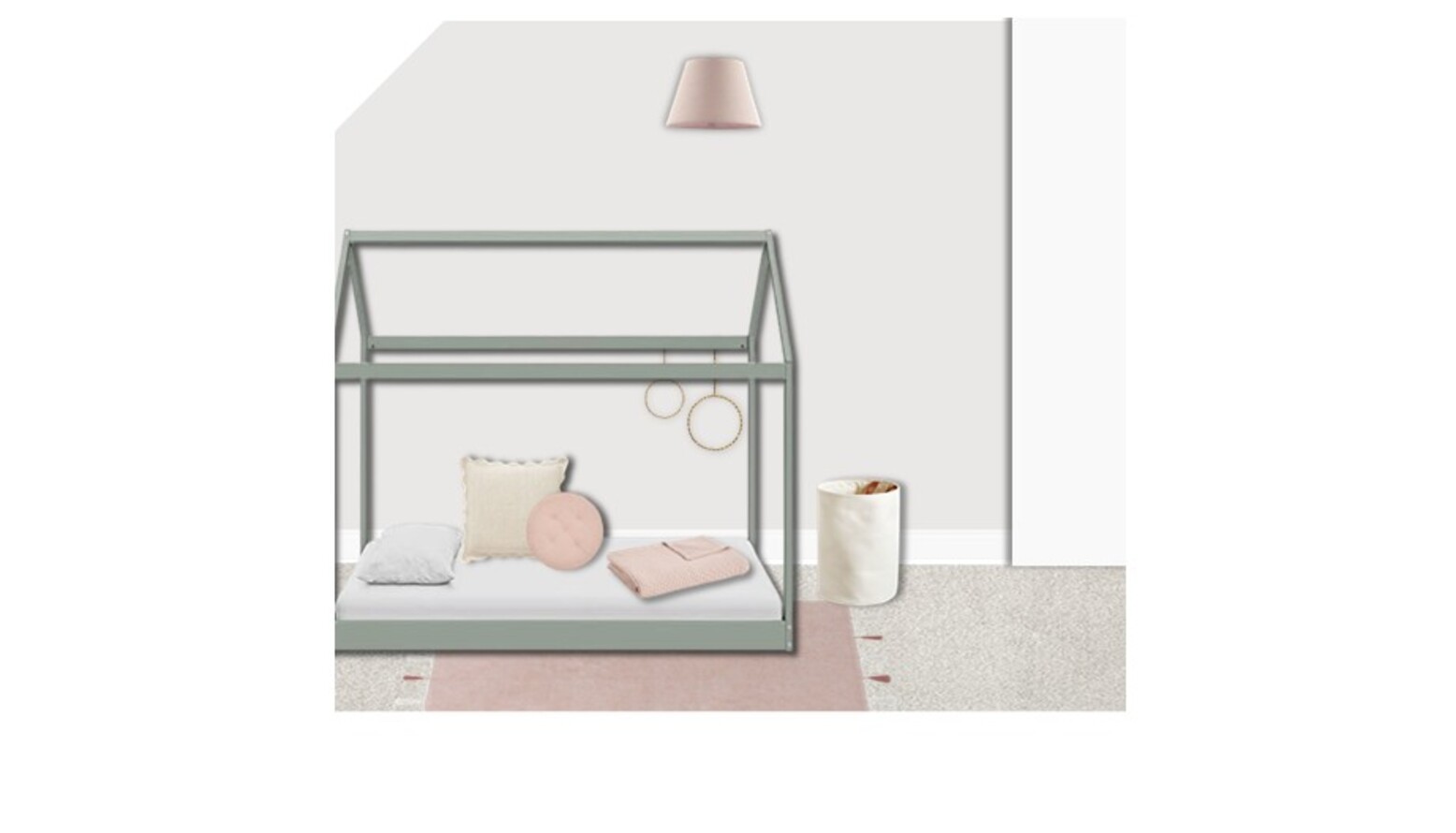 A whimsical children's bedroom, showcasing a house-shaped bed framed in a soft mint green. The bed has a minimalist design, adorned with a white mattress and playful cushions in soft pastels. A round pink cushion sits alongside a cozy folded blanket, adding a touch of comfort. The floor is covered with a washable rug in a gentle rose hue, creating a warm and inviting atmosphere. A creamy white laundry basket rests against the wall, subtly blending into the decor. The room is illuminated by a simple yet stylish ceiling light that harmonizes with the overall aesthetic. Wall-mounted shelving in oak veneer provides both functionality and visual interest, displaying decorative items such as potted succulents. The walls are painted in a light neutral tone, enhancing the airy feel of the space. Overall, the design prioritizes comfort and style while fostering a playful environment for creativity.