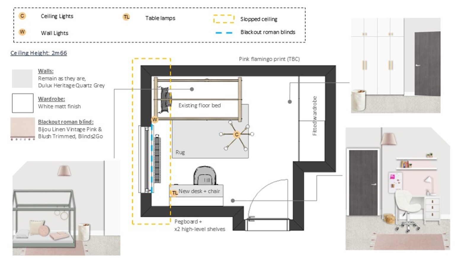 I have included some great options for the style of window dressing in Zoe's bedroom. All window dressing needs to be ordered in the correct size for your window(s) - to do this simply click the link on the window dressing suggestions, enter the size and you can place the order directly with the retailer